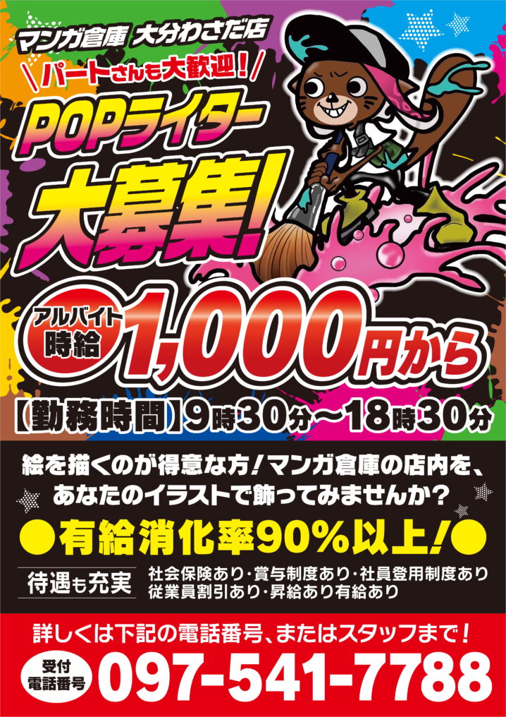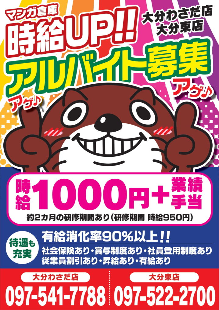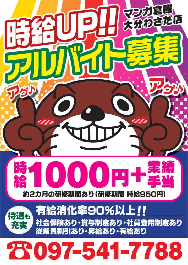 マンガ倉庫ではアルバイトさんの募集に余念がありません! 時給アップ!さらにアップ!! 1100円でございます!!! どんどん応募してくださいネッ(^^)/