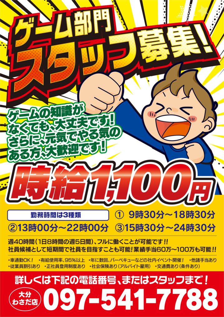 マンガ倉庫大分わさだ店ゲームコーナーで一緒に働いてくれるスタッフを大募集中! 「ゲームは好きだけどそこまで知識や経験が無いし…」 「switchなら持ってるけどPS5はわからない…」 など不安もあると思いますが、先輩スタ…