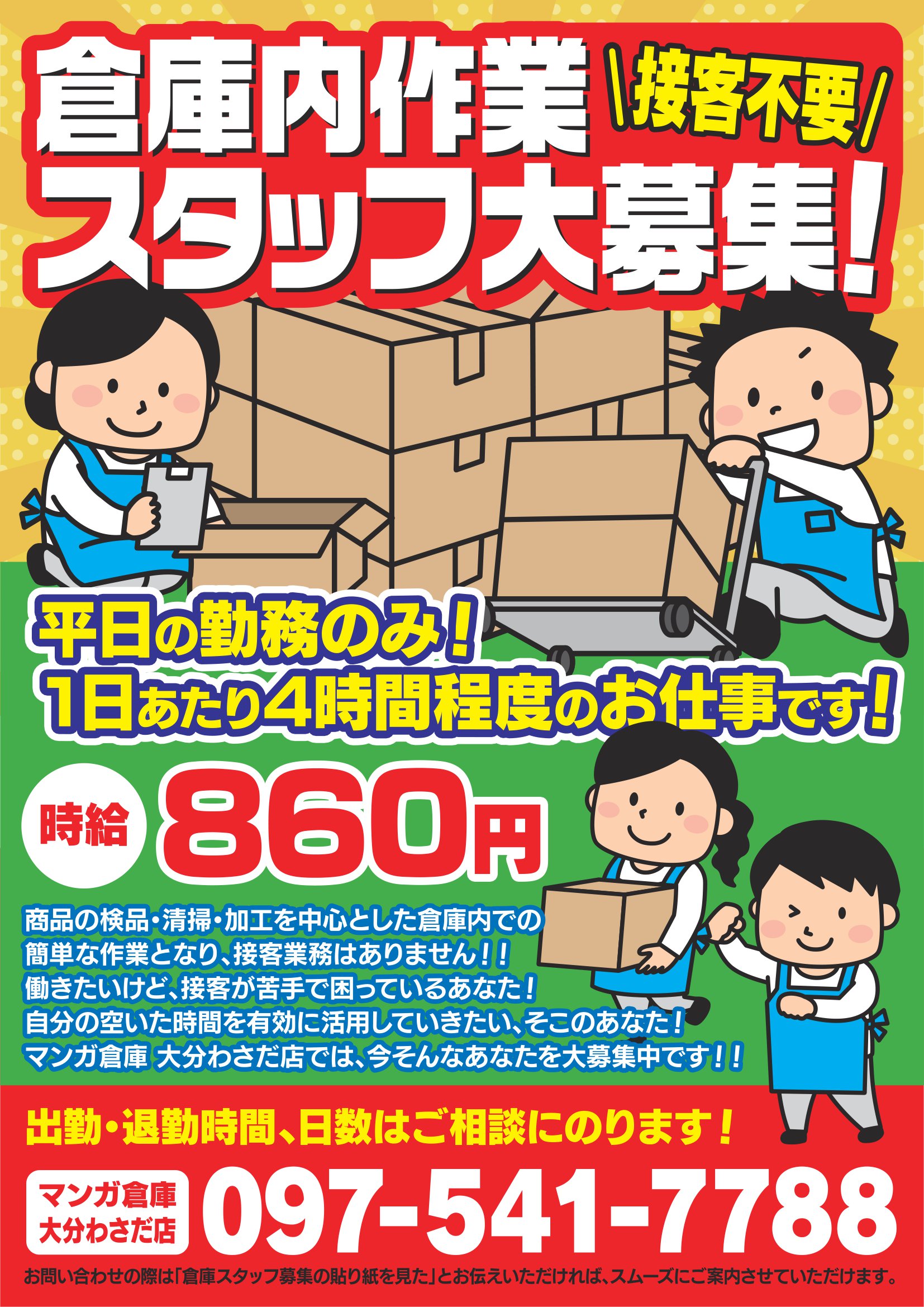 2023.10.01 求人情報 大分わさだ店 倉庫内作業スタッフさん大募集!! マンガ倉庫大分わさだ店からリクルートのお知らせです\(^o^)/ マンソーの倉庫内で作業をしていただけるスタッフさんを大募集しております! 商品の検品・清掃を中心とした、接客なしのお仕事です!! 接客にちょっぴり苦手意識のある方!もくもくとする作業が好きな方!! そんな方はぜひ当店での倉庫内作業、いかがでしょうか??? 就業時間、日数は相談でき〼! 平日のみの勤務でござい〼!! お電話お待ちしており〼!!\(^o^)/ 関連 コメントを残す コメントをキャンセルメールアドレスが公開されることはありません。 ※ が付いている欄は必須項目ですコメント ※ 名前 ※ メール ※ サイト 新しいコメントをメールで通知 新しい投稿をメールで受け取る Δ