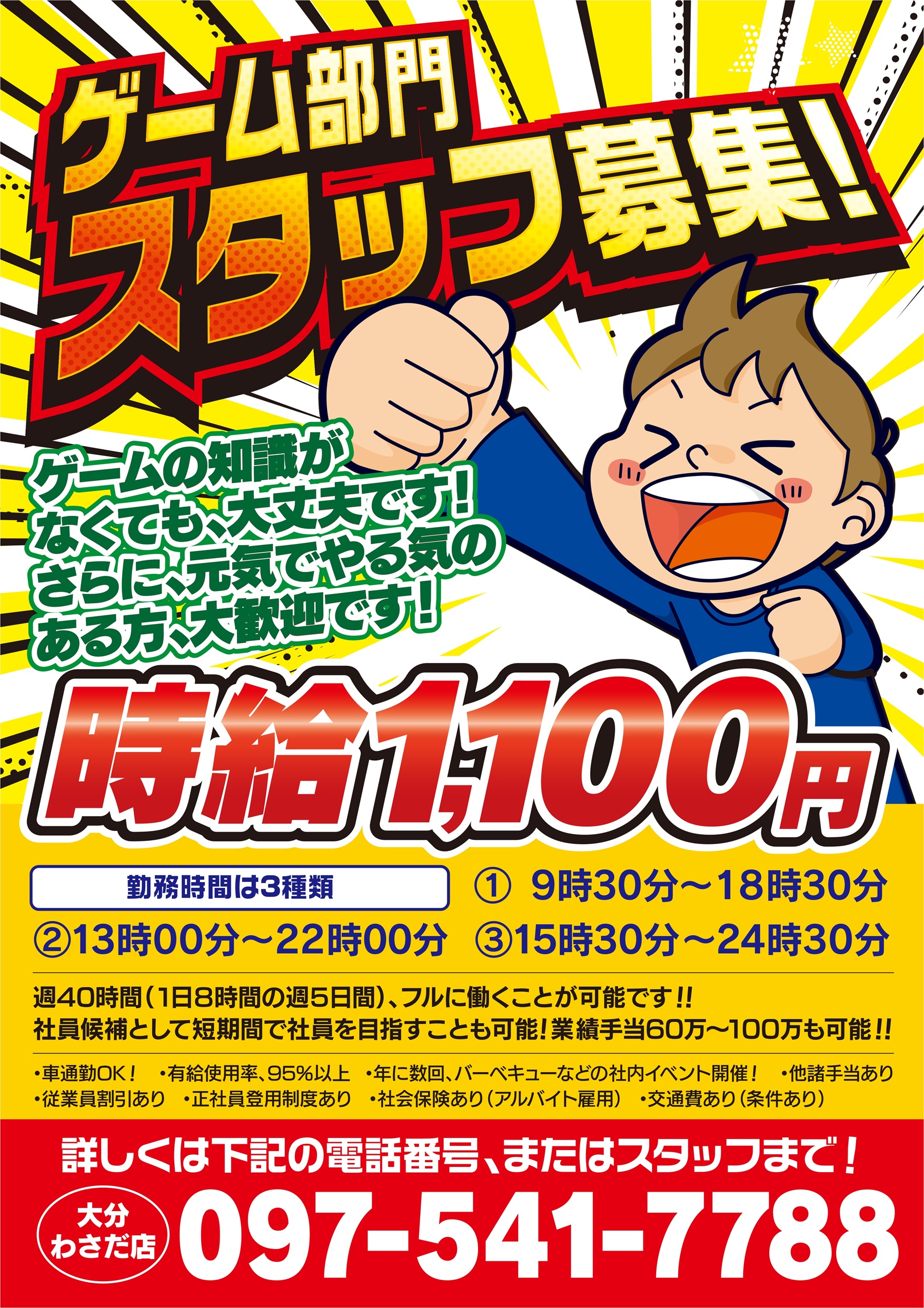 2025.03.14 求人情報 takalab_1 大分わさだ店ゲームコーナースタッフ大募集中! マンガ倉庫大分わさだ店ゲームコーナーで一緒に働いてくれるスタッフを大募集中! 「ゲームは好きだけどそこまで知識や経験が無いし…」 「switchなら持ってるけどPS5はわからない…」 など不安もあると思いますが、先輩スタッフが丁寧に説明・フォローします! ぜひ一度お電話ください! 関連 コメントを残す コメントをキャンセルメールアドレスが公開されることはありません。 ※ が付いている欄は必須項目ですコメント ※ 名前 ※ メール ※ サイト 新しいコメントをメールで通知 新しい投稿をメールで受け取る Δ