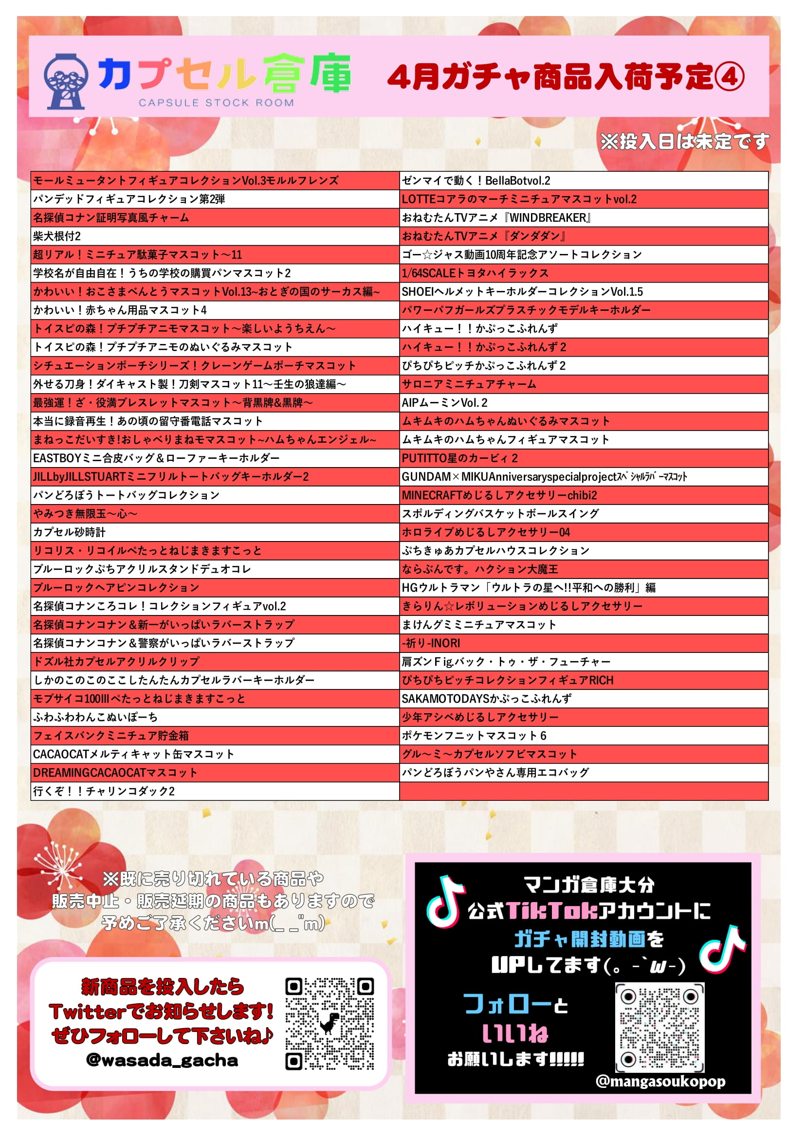 カプセル倉庫のガチャの投入日は未定ですので、店舗にお問い合わせいただいてもお答えできませんm(_ _)m