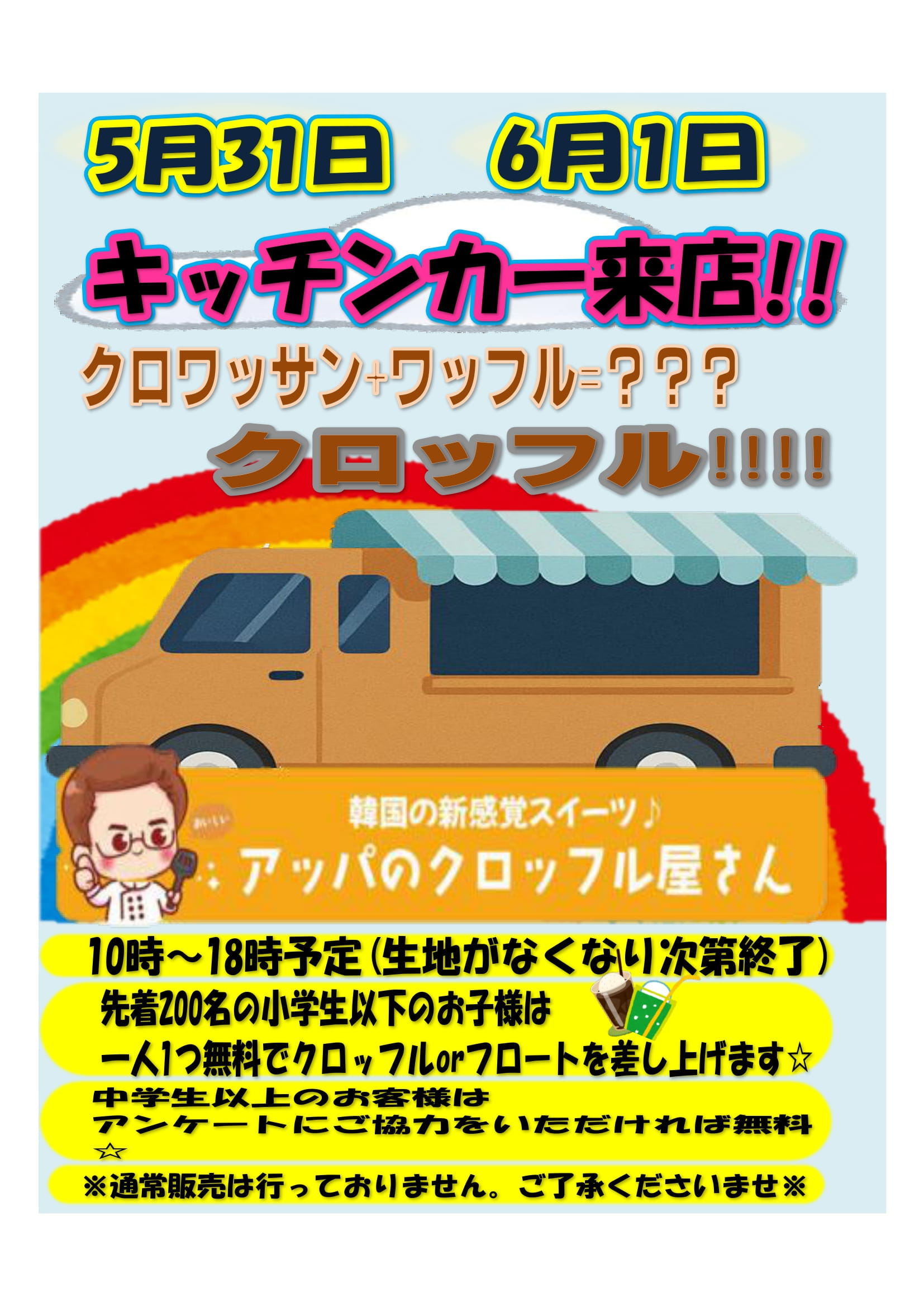 2025.05.30 イベント情報 takalab_2 ■《5月31日・6月1日》キッチンカーがきまーす!!■ キッチンカーがきまーす!! マンガ倉庫わさだ店、5月31日と6月1日にキッチンカーがやってきます!! 韓国発のハイブリットスイーツ『クロッフル』!!! クロワッサンのワッフル? ワッフルのクロワッサン? …謎は深まるばかり… 気になる方はぜひ当日店頭までお越しくださいませ(^^)/ 関連 コメントを残す コメントをキャンセルメールアドレスが公開されることはありません。 ※ が付いている欄は必須項目ですコメント ※ 名前 ※ メール ※ サイト 新しいコメントをメールで通知 新しい投稿をメールで受け取る Δ