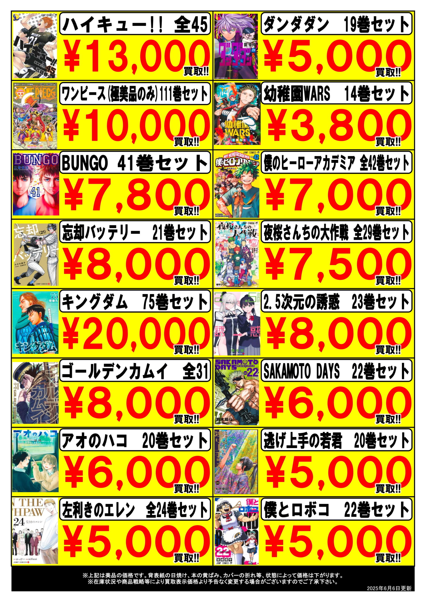 2025.06.06 買取情報 takalab_6 ◆買取情報更新!◆ 集英社人気タイトルセットの買取価格を更新しました🔥 皆様の買取お待ちしています‼️ ※2025/6/6現在の価格となります。 在庫状況・状態によってお値段が変動いたします。予めご了承ください。 **************** こちら↓もぜひチェックしてみてくださいね♪(*´▽`*) ・最新のイベント情報はこちら ・最新の買取情報はこちら 関連 コメントを残す コメントをキャンセルメールアドレスが公開されることはありません。 ※ が付いている欄は必須項目ですコメント ※ 名前 ※ メール ※ サイト 新しいコメントをメールで通知 新しい投稿をメールで受け取る Δ