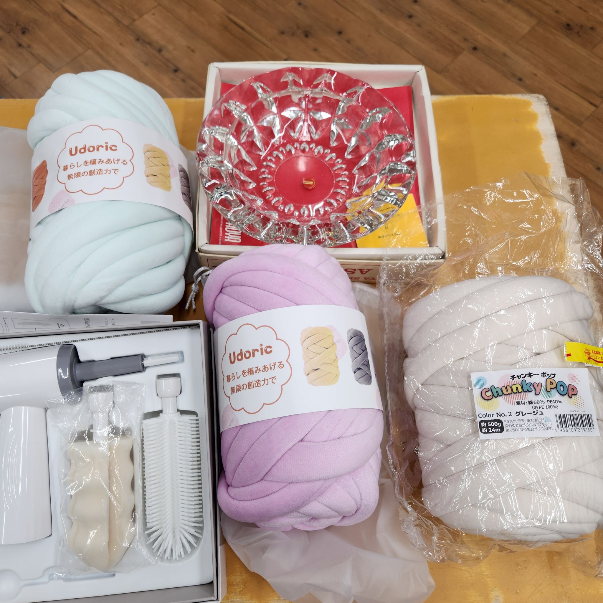 毛布ヤーンやtシャツヤーン、未使用の哺乳瓶ブラシ、ガラスの灰皿を買取させて頂きました!!