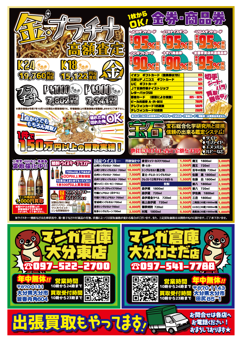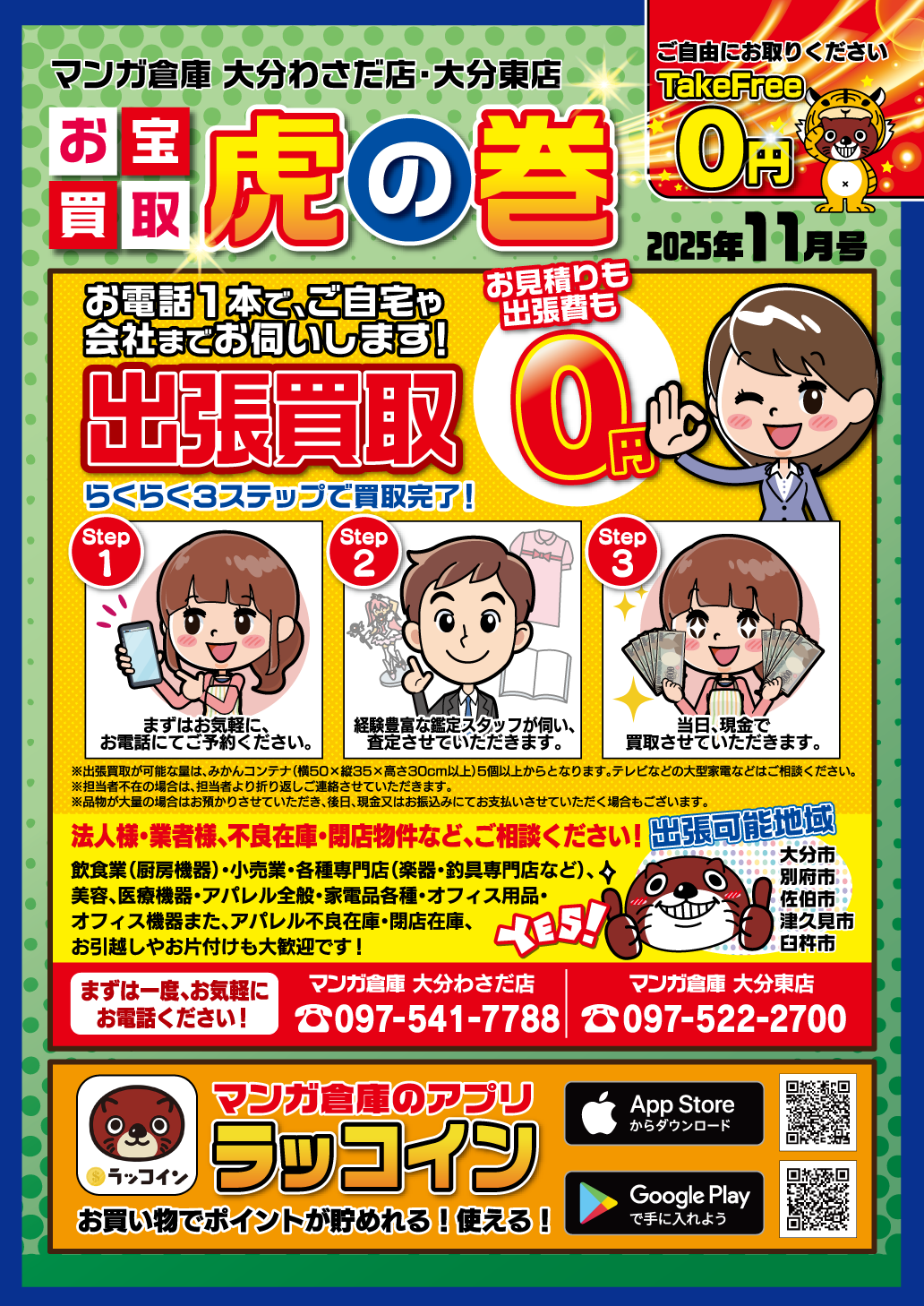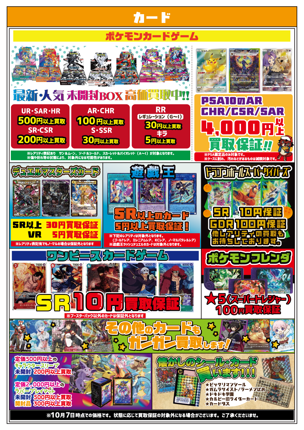 2025.11.01 買取情報 takalab_5 お宝買取!!【虎の巻11月号】できました🐯 お宝買取虎の巻11月号ができました!°˖✧◝(⁰▿⁰)◜✧˖° WEBチラシにも一緒に掲載しておりますので、そちらもご覧ください! 2025年11月1日現在の価格なので、 最新の価格はWEBチラシバナーをタップしてご確認ください! ★2025/11/1 発行★ 関連 コメントを残す コメントをキャンセルメールアドレスが公開されることはありません。 ※ が付いている欄は必須項目ですコメント ※ 名前 ※ メール ※ サイト 新しいコメントをメールで通知 新しい投稿をメールで受け取る Δ