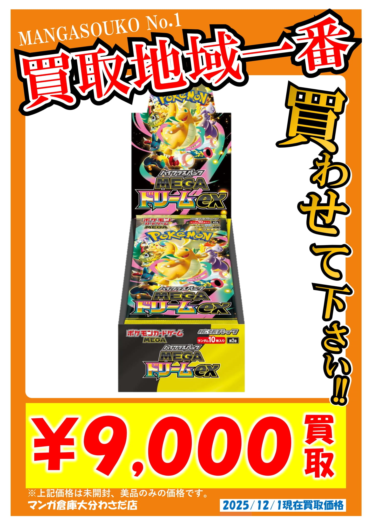2025.12.01 買取情報 takalab_5 ☆ポケモンカード⭐MEGAドリームexの買取価格を変更しました☆ MEGAドリームex ¥9,000買取! ※シュリンク未開封、美品の価格です。 ご来店お待ちしております\( ・ω・ )/ ※2025/12/1現在の価格となります。 在庫状況・状態によってお値段が変動いたします。予めご了承ください。 **************** こちら↓もぜひチェックしてみてくださいね♪(*´▽`*) ・最新のイベント情報はこちら ・最新の買取情報はこちら 関連 コメントを残す コメントをキャンセルメールアドレスが公開されることはありません。 ※ が付いている欄は必須項目ですコメント ※ 名前 ※ メール ※ サイト 新しいコメントをメールで通知 新しい投稿をメールで受け取る Δ