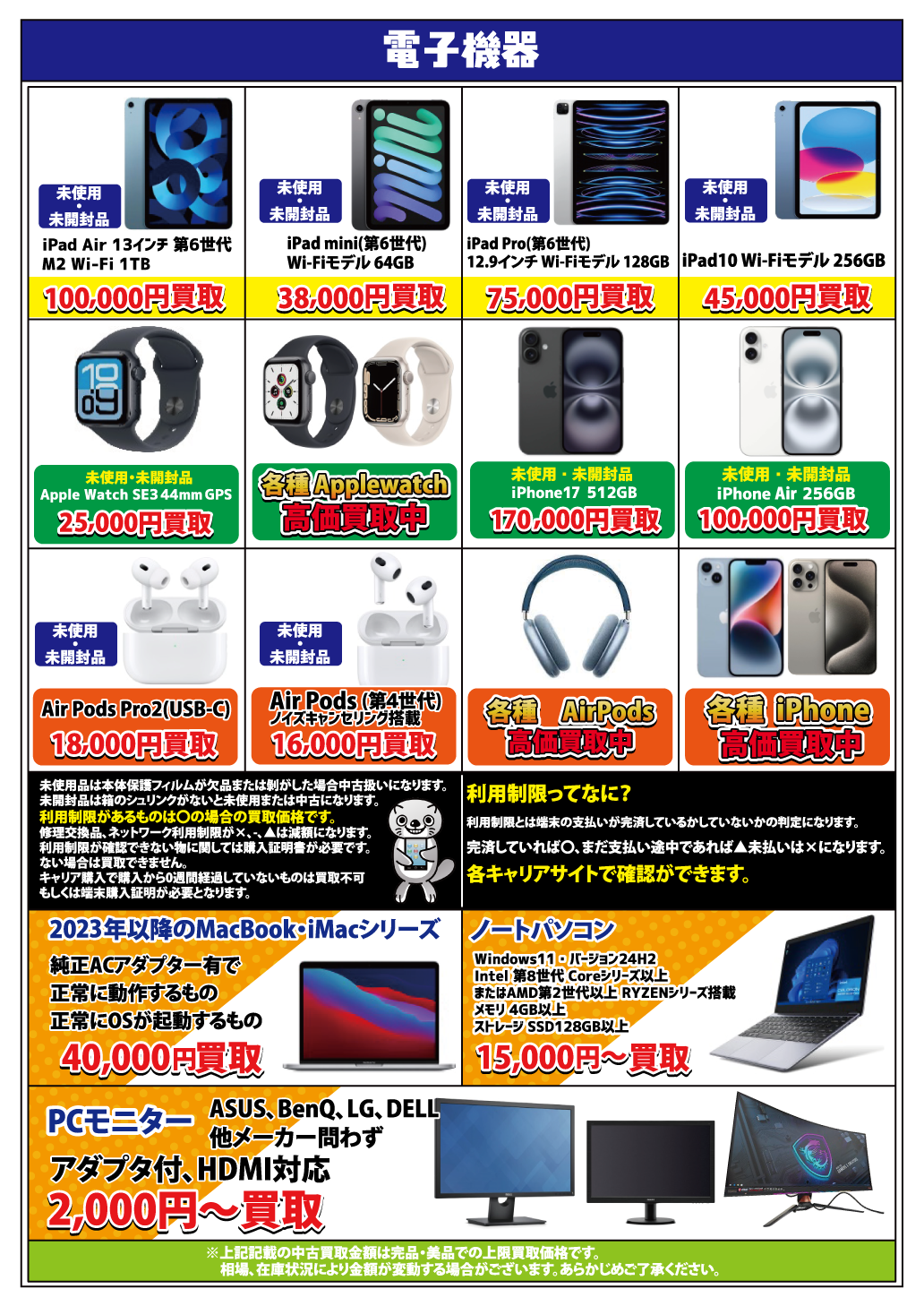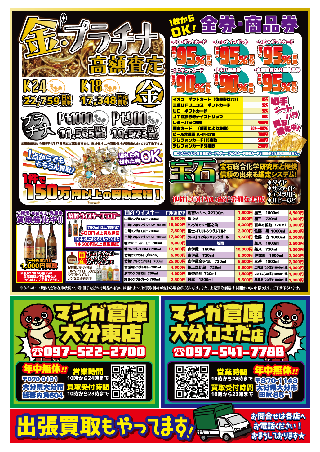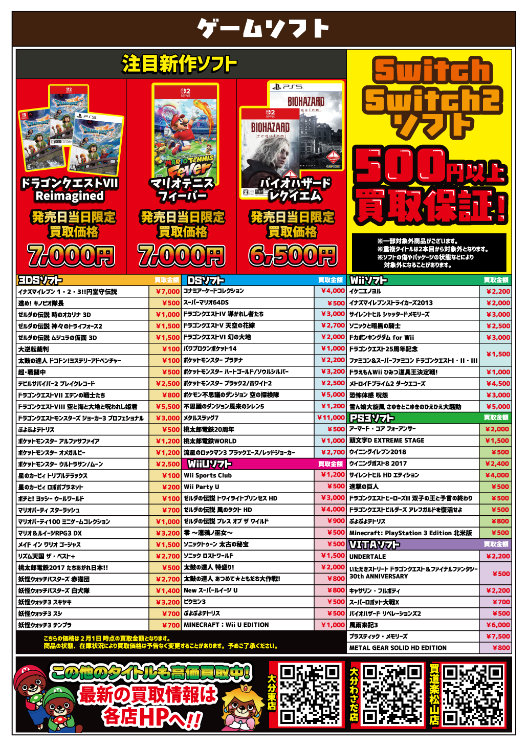 2026.02.01 買取情報 takalab_4 お宝買取!!【虎の巻2月号】できました🐯 お宝買取虎の巻2月号ができました!°˖✧◝(⁰▿⁰)◜✧˖° WEBチラシにも一緒に掲載しておりますので、そちらもご覧ください! 2026年2月1日現在の価格なので、 最新の価格はWEBチラシバナーをタップしてご確認ください! ★2026/2/1 発行★ 関連 コメントを残す コメントをキャンセルメールアドレスが公開されることはありません。 ※ が付いている欄は必須項目ですコメント ※ 名前 ※ メール ※ サイト 新しいコメントをメールで通知 新しい投稿をメールで受け取る Δ