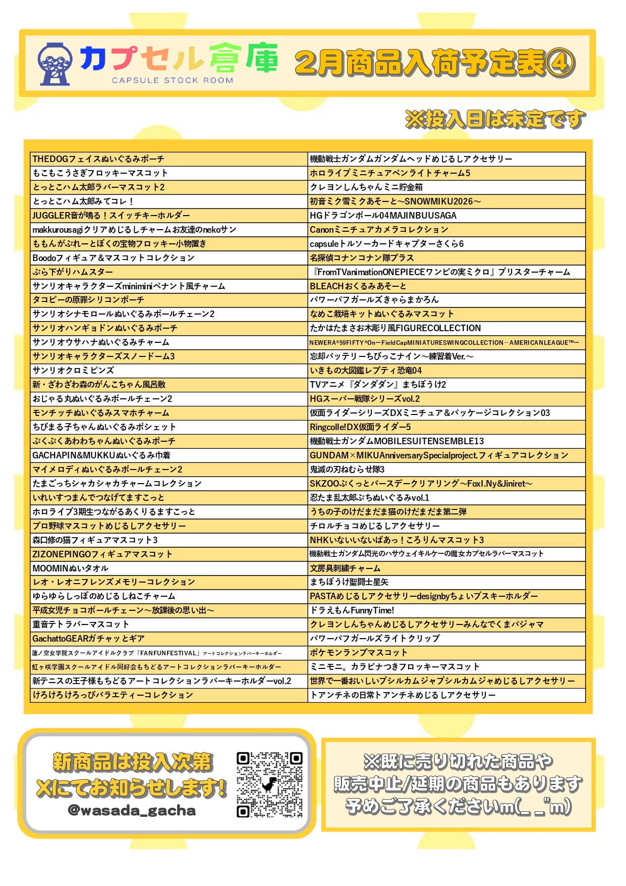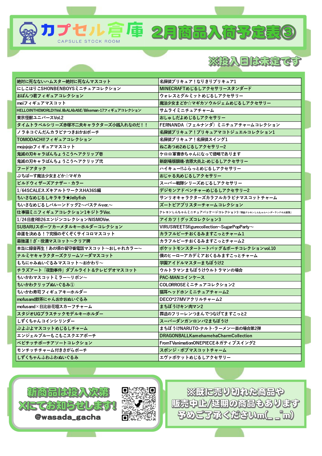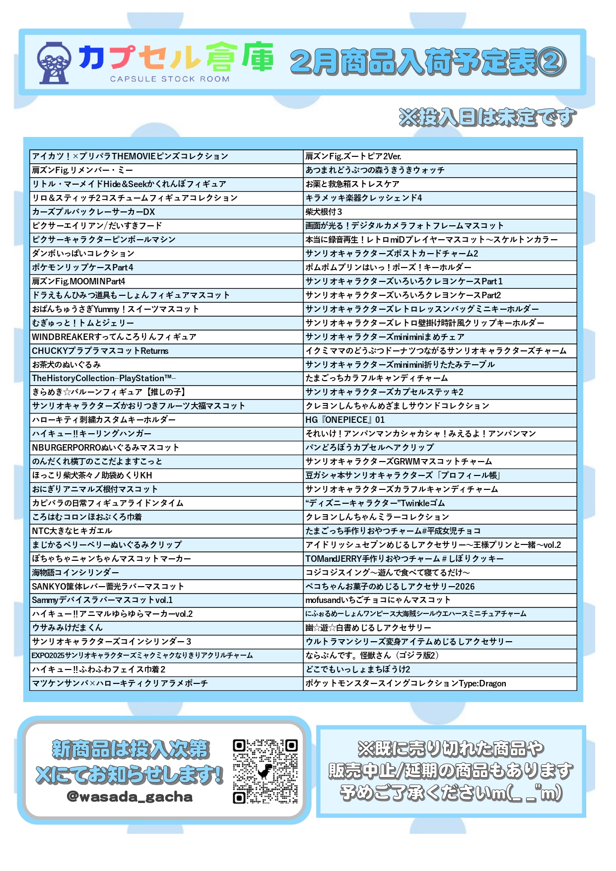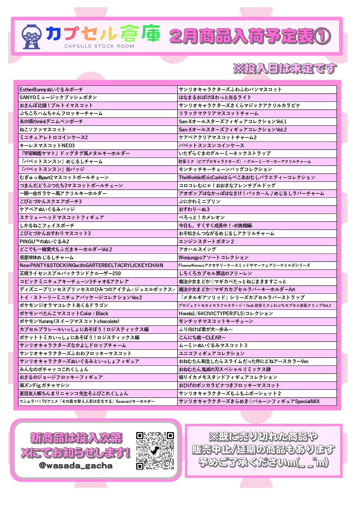 カプセル倉庫2月商品予定表です!(*≧∀≦*)