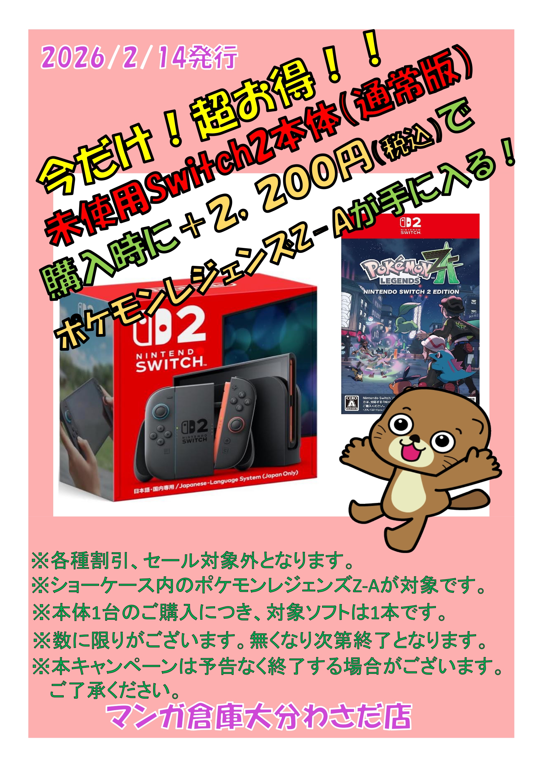 2026.02.14 イベント情報 takalab_1 Switch2でお得なキャンペーン開始!! 本日から未使用Nintendo Switch2本体をご購入時に+2200円でポケモンレジェンズZ-Aが手に入ります!! ポケモンZ-Aをお得に手に入れるビッグチャンスです✨ わさだ店のみの開催ですので、Switch2本体やポケモンZAをお求めの場合はぜひ当店にお越しください! みなさまのご来店をお待ちしております!! **************** こちら↓もぜひチェックしてみてくださいね♪(*´▽`*) ・最新のイベント情報はこちら ・最新の買取情報はこちら 関連 コメントを残す コメントをキャンセルメールアドレスが公開されることはありません。 ※ が付いている欄は必須項目ですコメント ※ 名前 ※ メール ※ サイト 新しいコメントをメールで通知 新しい投稿をメールで受け取る Δ
