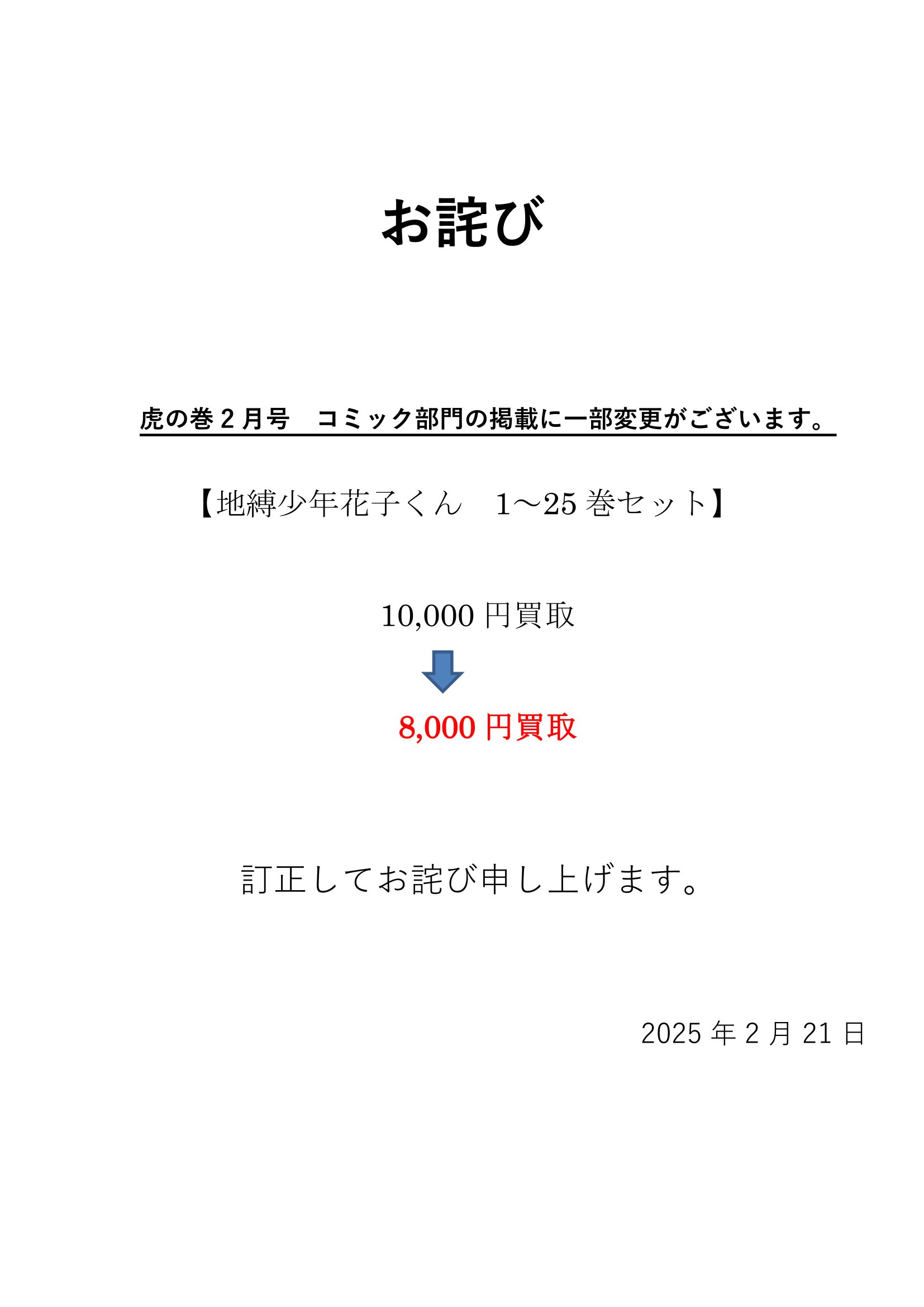 2026.02.21 お知らせ takalab_5 虎の巻2月号一部買取価格変更のお知らせ 相場価格の変動と在庫過剰により下記のタイトルの買取価格を変更させていただきます。 ⚠️こちらは2月21日時点での買取価格です。 マンガ倉庫大分わさだ店独自の買取価格となっております。 予めご了承ください。 関連 コメントを残す コメントをキャンセルメールアドレスが公開されることはありません。 ※ が付いている欄は必須項目ですコメント ※ 名前 ※ メール ※ サイト 新しいコメントをメールで通知 新しい投稿をメールで受け取る Δ
