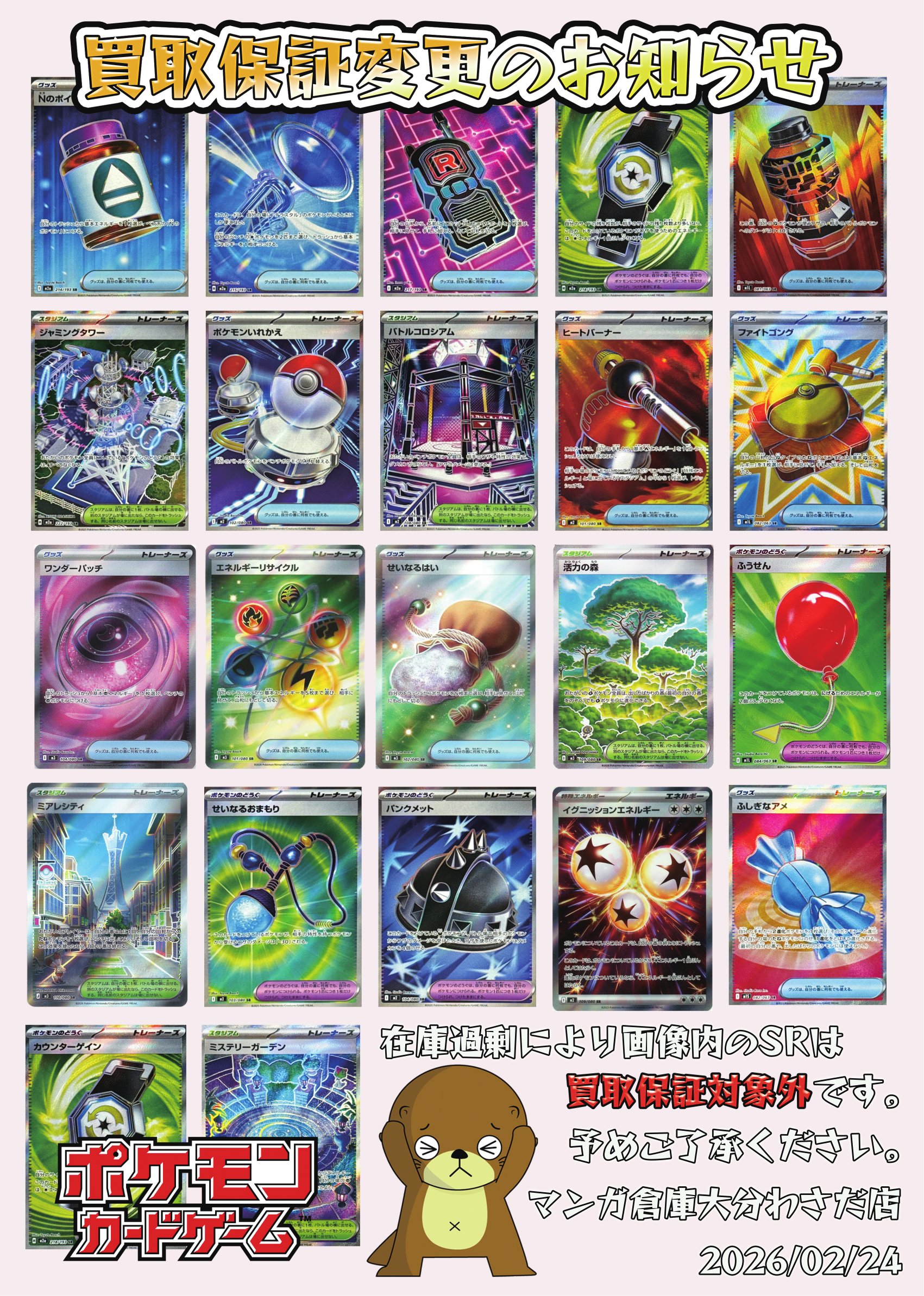 2026.02.24 買取情報 takalab_6 ポケモンカード、買取保証一部変更のお知らせ! 今までは、ほぼ全てのSRに200円保証を適用していましたが、在庫が多くなってきましたので一部のSRは買取保証対象外となります。 上記画像のSRは本日(2/24)より、200円保証対象外です。ご了承ください。 ※2026/2/24現在の価格となります。 在庫状況・状態によってお値段が変動いたします。予めご了承ください。 **************** こちら↓もぜひチェックしてみてくださいね♪(*´▽`*) ・最新のイベント情報はこちら ・最新の買取情報はこちら 関連 コメントを残す コメントをキャンセルメールアドレスが公開されることはありません。 ※ が付いている欄は必須項目ですコメント ※ 名前 ※ メール ※ サイト 新しいコメントをメールで通知 新しい投稿をメールで受け取る Δ