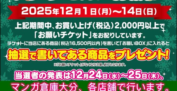 🎄✨🎅 マンガ倉庫大分わさだ店 クリスマスイベント開催 🎁⛄🎉 📅 12/6(土)~12/21(日) …