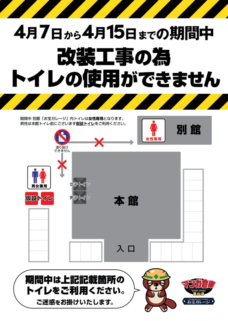 改装工事のお知らせ 4/7㈫~4/15㈬までの期間中、改装工事のためトイレの…