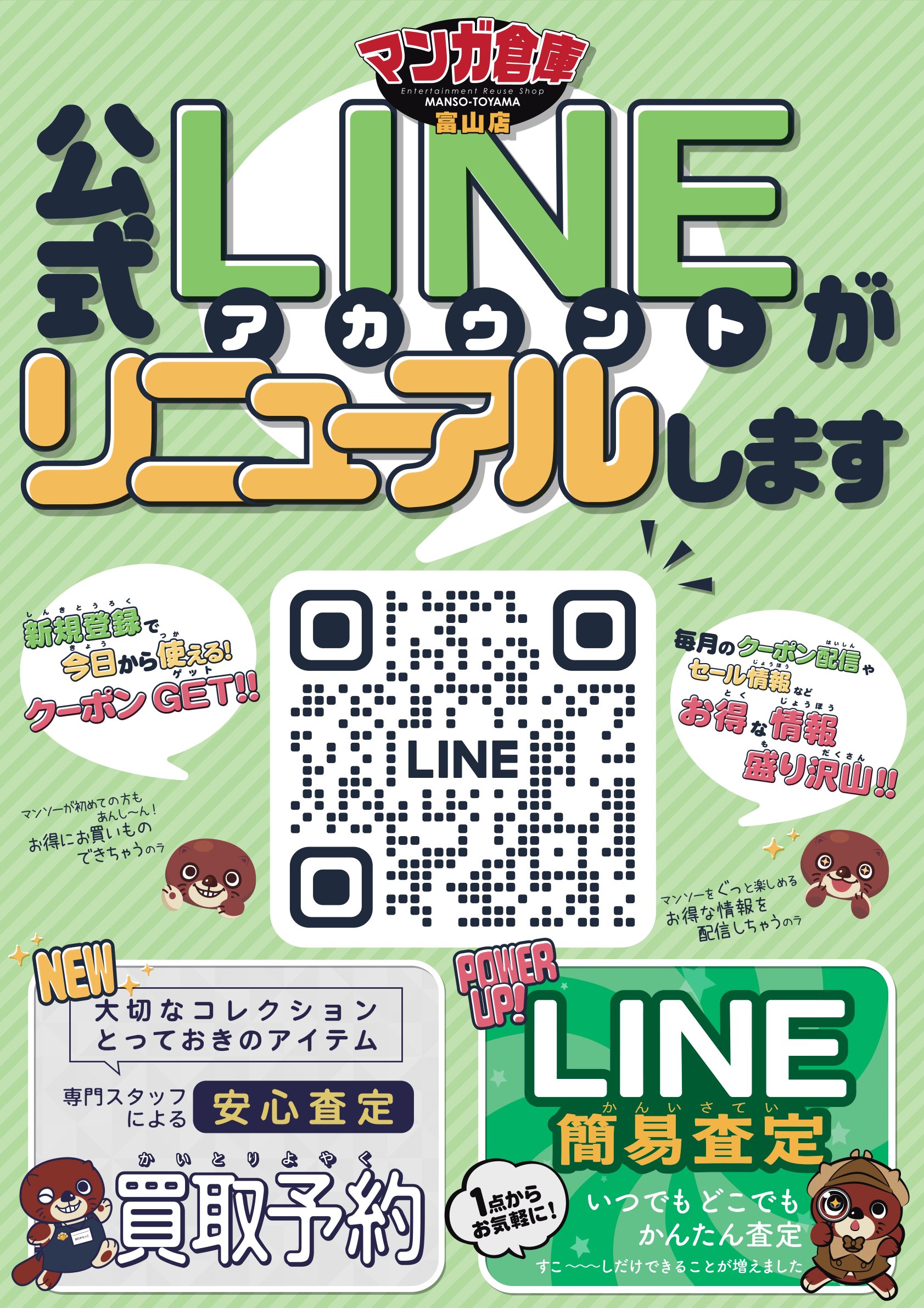 マンガ倉庫富山店 公式LINEを『お友達追加』すると… 毎月おトクなクーポンやイベント参加券、セールの情報が届く✨ 抽選で3000円分のマンガ倉庫富山店オリジナル商品券が当たっちゃうチャンスも⁉️ さらに使える便利機能👀‼️ 写真で簡単お見積もり‼️ 『LINE簡易査定』 & 大切なコレクション・とっておきのアイテムを専門スタッフにおまかせ‼️ 『買取予約』 『お友達追加』で今すぐ使えるクーポンGET‼️ ぜひ登録しておいてね❣️🦦