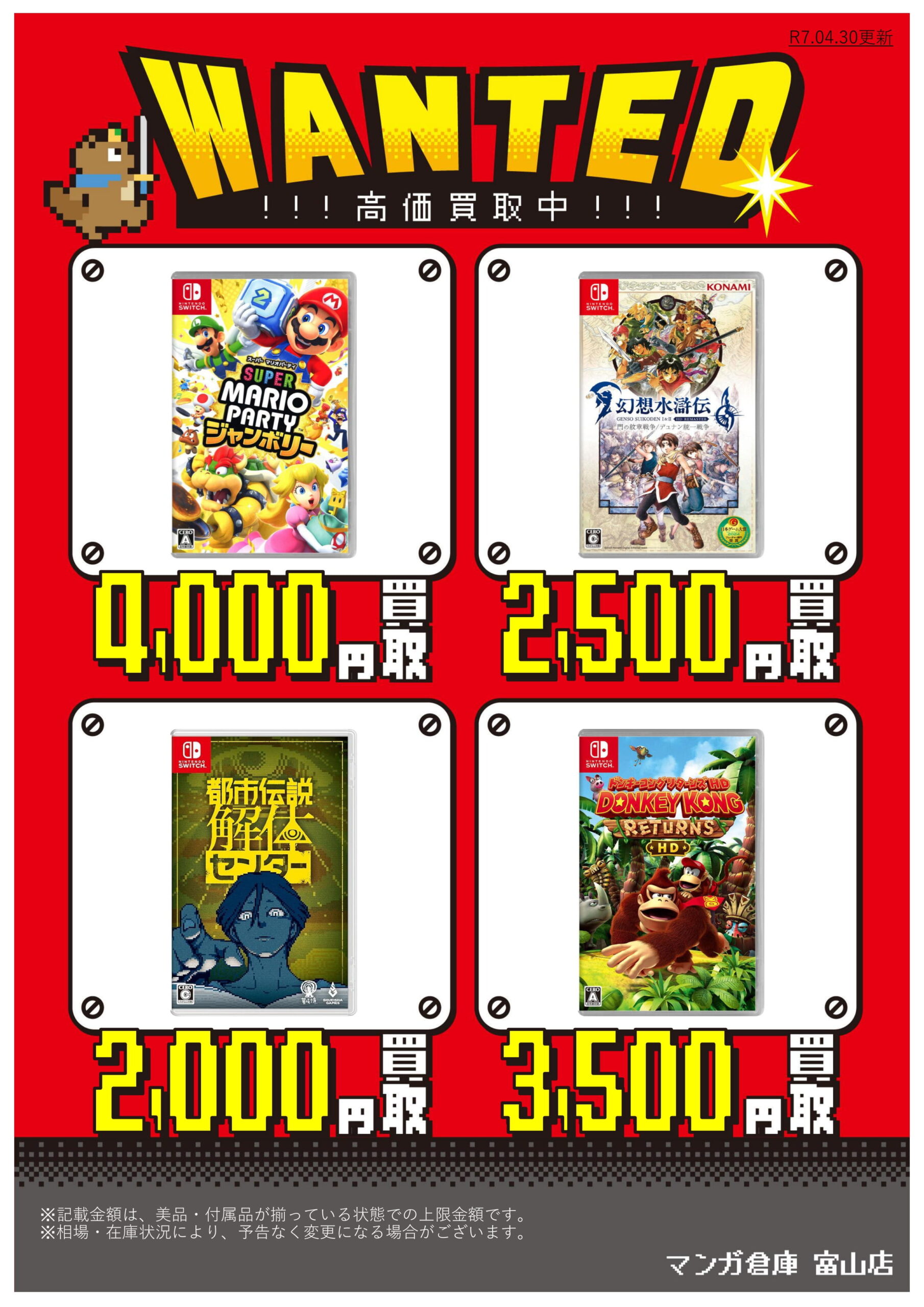 ■PS5/Switchソフト買取告知更新しました!◆#ゲーム■ 買取情報 ゲーム 2025年5月1日 PS5/Switchソフト買取告知更新しました! ゲームソフト買取告知更新しました! 今月もまだまだ買います!ソフト買取プラスアップ強化中! 対象のソフトをまとめてお売りいただくと、いつもよりさらにたか~く買取させていただきます! ぜひ当店までお持ちください! ※2025/5/1現在の価格となっております。 状況によりお値段が変動する場合がございます。 ◆◇◇◆◆◇◇◆◆◇◇◆◆◇◇◆◆◇◇◆◆◇◇◆◆◇◇◆◆◇◇◆◆◇◇◆◆◇◇◆ ・最新のイベント情報はこちら ・最新の買取情報はこちら