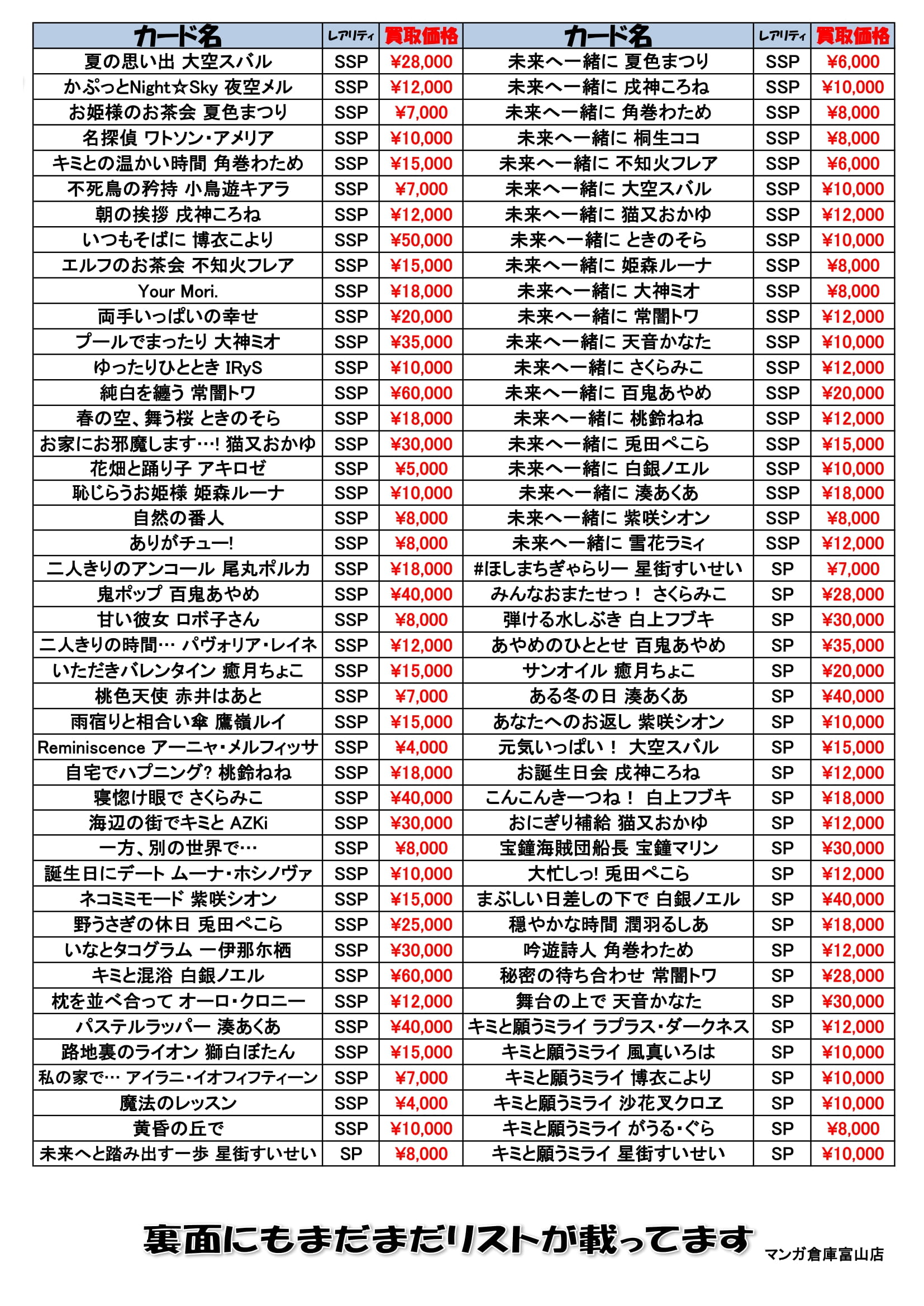 ヴァイスシュヴァルツ ホロライブver 買取告知更新しました! 買取情報 カード 2025年5月15日 買取告知! ※2025/5/15現在の価格となっております。 状況によりお値段が変動する場合がございます。 ◆◇◇◆◆◇◇◆◆◇◇◆◆◇◇◆◆◇◇◆◆◇◇◆◆◇◇◆◆◇◇◆◆◇◇◆◆◇◇◆ ・最新のイベント情報はこちら ・最新の買取情報はこちら