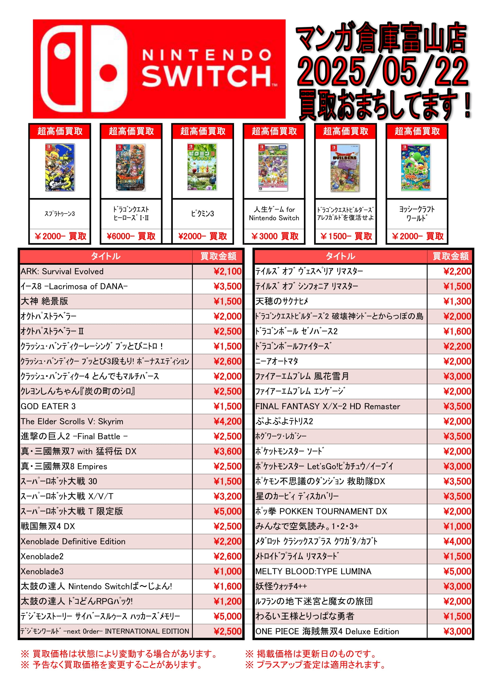 ◆◇PS5/Switchソフト買取告知更新しました!◇◆ #ゲーム 買取情報 ゲーム 2025年5月22日 ゲームソフト買取告知更新しました! 今月もまだまだ買います!ソフト買取プラスアップ強化中! 対象のソフトをまとめてお売りいただくと、いつもよりさらにたか~く買取させていただきます! ぜひ当店までお持ちください! ※2025/5/22現在の価格となっております。 状況によりお値段が変動する場合がございます。 ◆◇◇◆◆◇◇◆◆◇◇◆◆◇◇◆◆◇◇◆◆◇◇◆◆◇◇◆◆◇◇◆◆◇◇◆◆◇◇◆ ・最新のイベント情報はこちら ・最新の買取情報はこちら