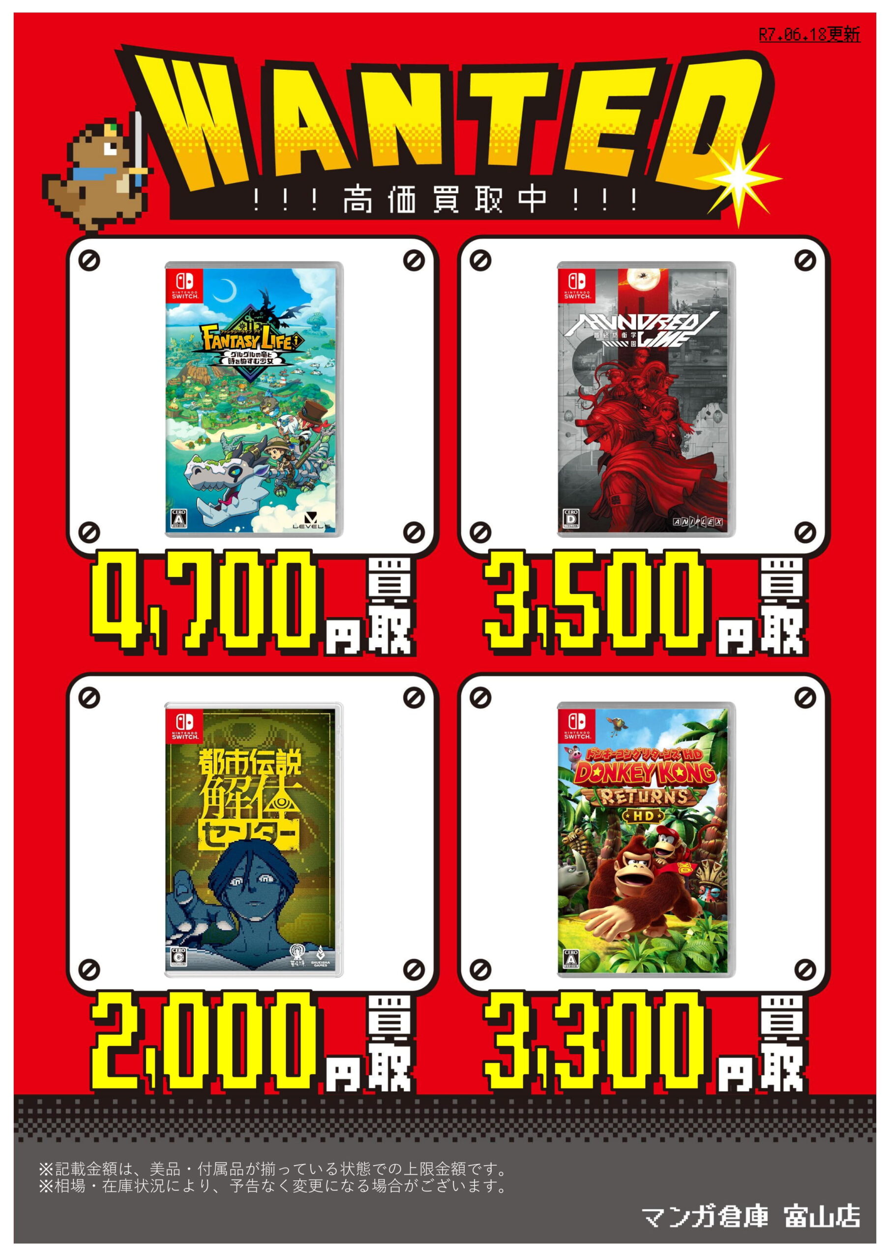 ◆PS5/Switchソフト買取告知更新しました!◆ #ゲーム 買取情報 ゲーム 2025年6月18日 ゲームソフト買取告知更新しました! ソフト買取プラスアップキャンペーン中! 対象のソフトをまとめてお売りいただくと、通常の査定金額よりプラスアップ! ぜひ当店までお持ちください! ※2025/6/18現在の価格となっております。 状況によりお値段が変動する場合がございます。 ◆◇◇◆◆◇◇◆◆◇◇◆◆◇◇◆◆◇◇◆◆◇◇◆◆◇◇◆◆◇◇◆◆◇◇◆◆◇◇◆ ・最新のイベント情報はこちら ・最新の買取情報はこちら