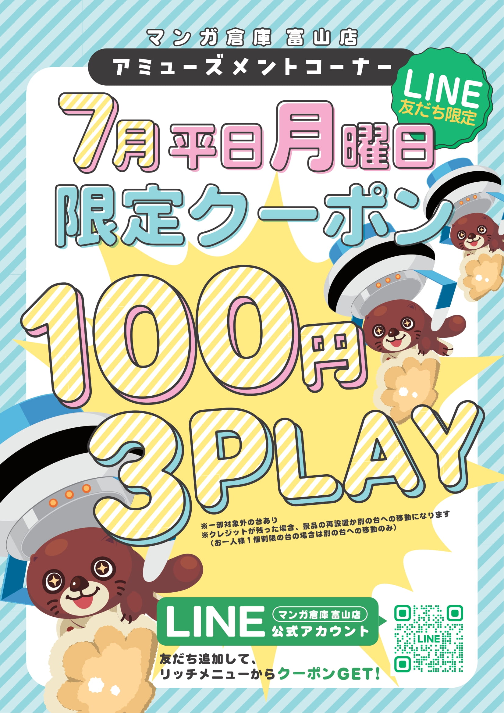 【イベント情報】アミューズメント 100円3 PLAYクーポン【LINEお友達限定】#イベント情報 イベント情報 2025年7月1日 ☆イベント情報☆ 🛸アミューズメントコーナー🛸 100円3PLAYクーポン 平日月曜・7/7、14、28日はお得に遊べちゃう!! LINEのお友達登録でクーポンをGET!! 登録はこちらから👇 ◆◇◇◆◆◇◇◆◆◇◇◆◆◇◇◆◆◇◇◆◆◇◇◆◆◇◇◆◆◇◇◆◆◇◇◆◆◇◇◆ ・最新のイベント情報はこちら ・最新の買取情報はこちら