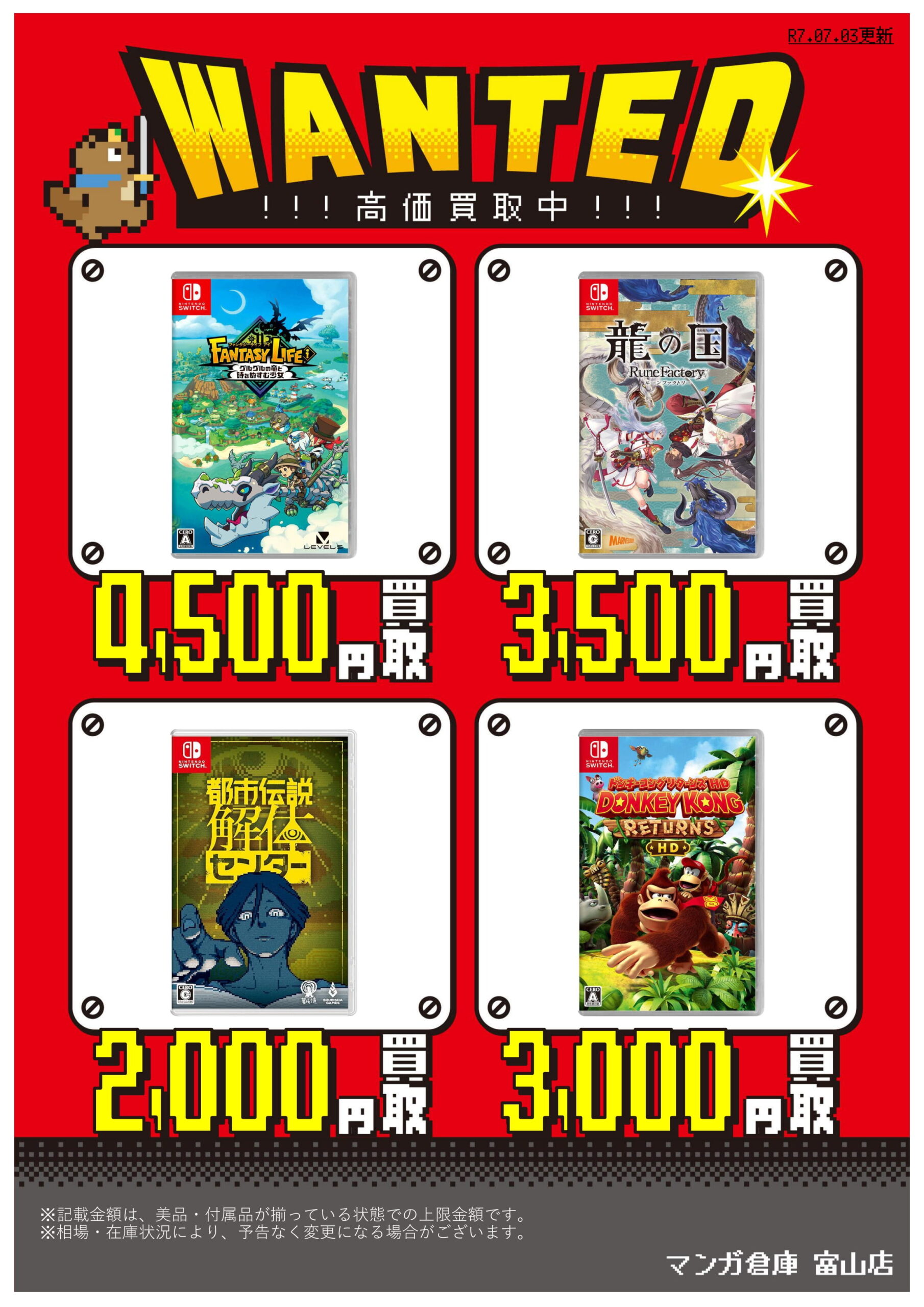 ■ゲーム 買取情報■ 買取情報 ゲーム 2025年7月3日 ★ゲーム 買取情報★ 買取告知 更新しました! ゲームソフト買取告知更新しました! ソフト買取プラスアップキャンペーン中! 対象のソフトをまとめてお売りいただくと、通常の査定金額よりプラスアップ! ぜひ当店までお持ちください! ※2025/7/3 現在の価格となります。 在庫状況などによってお値段が変動いたします。予めご了承ください。 ******************** 〖ゲーム〗買取告知はこちら