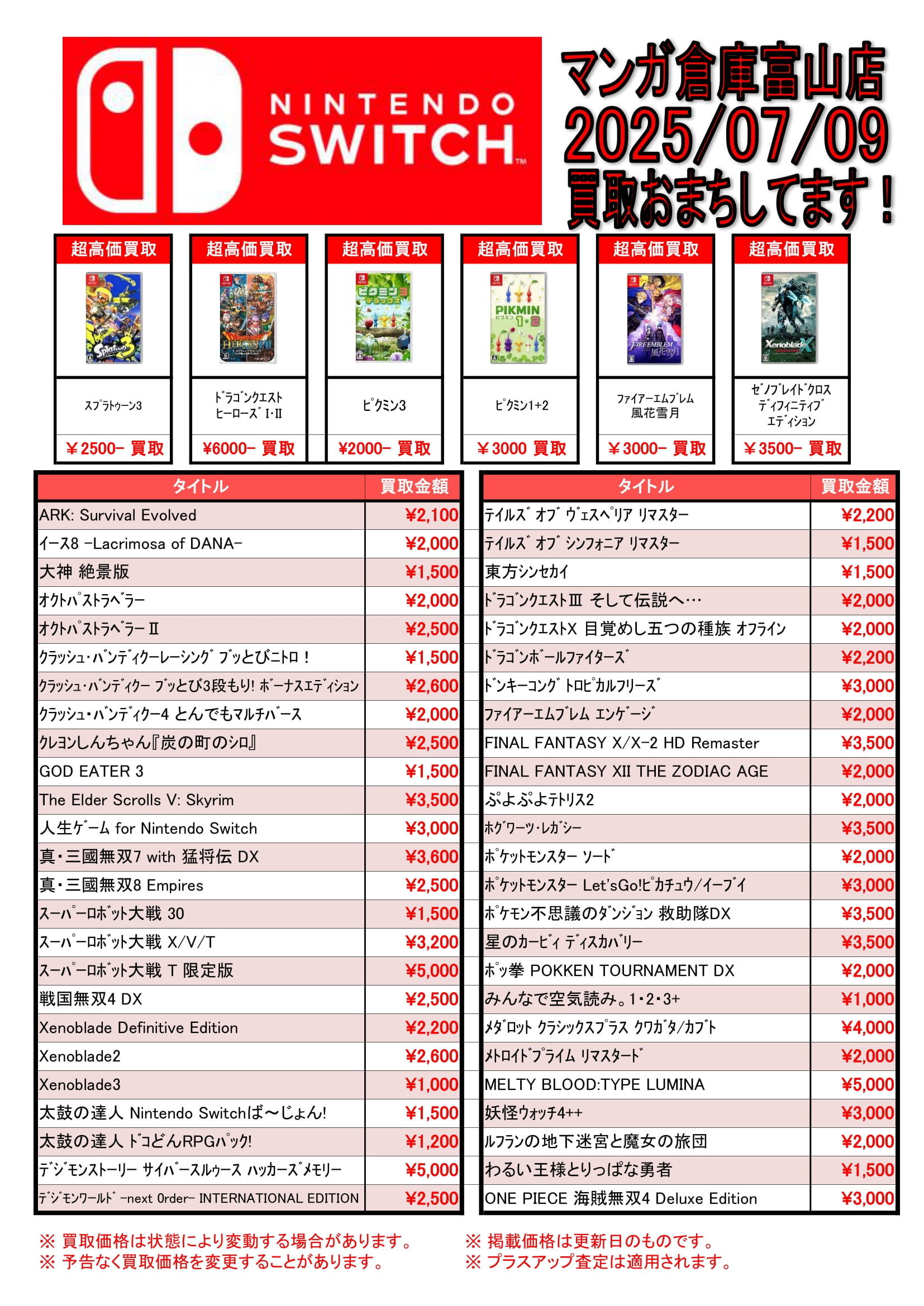 ゲーム 買取告知《PS5/PS4/Switchソフト買取告知更新》 買取情報 ゲーム 2025年7月9日 【ゲーム 買取告知】 PS5/PS4/Switchソフト買取告知更新 ゲームソフト買取告知更新しました! ソフト買取プラスアップキャンペーン中! 対象のソフトをまとめてお売りいただくと、通常の査定金額よりプラスアップ! ぜひ当店までお持ちください! ※2025/7/9 現在の価格となります。 在庫状況などによってお値段が変動いたします。予めご了承ください。 ******************** ★〖ゲーム〗買取告知は👉こちら★