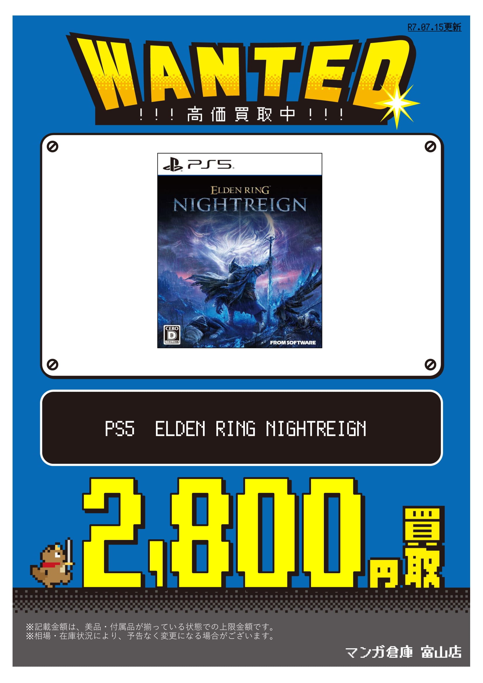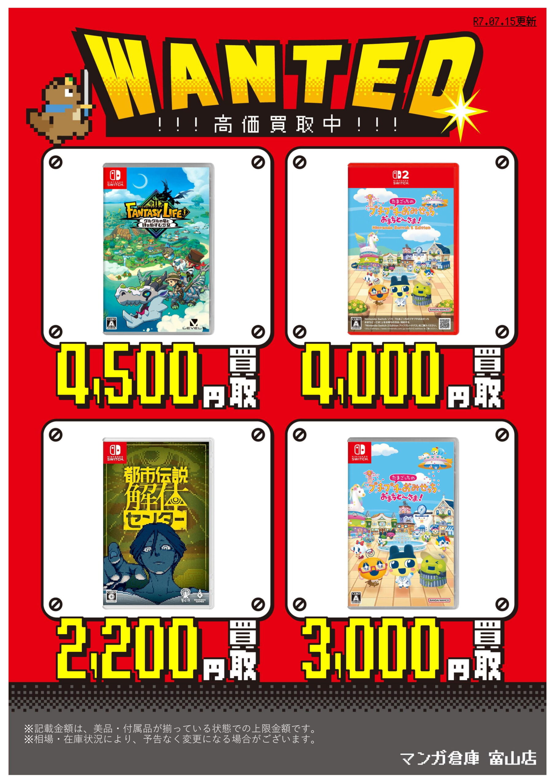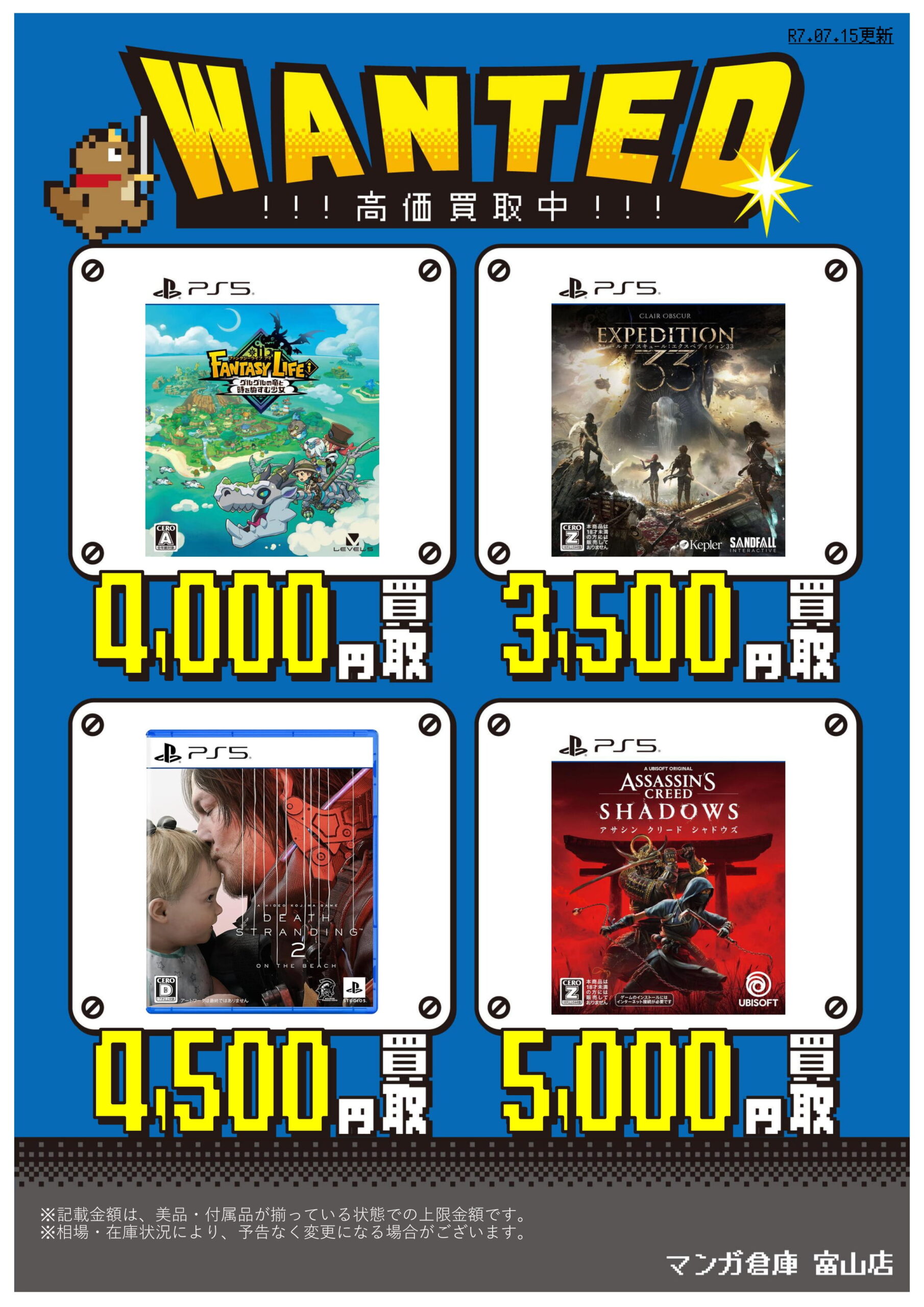 ■PS5/Switchソフト買取告知更新!■ 買取情報 ゲーム 2025年7月15日 【ゲーム 買取告知】 PS5/Switchソフト買取告知更新 ゲームソフト買取告知更新しました! ソフト買取プラスアップキャンペーン中! 対象のソフトをまとめてお売りいただくと、通常の査定金額よりプラスアップ! ぜひ当店までお持ちください! ※2025/7/15 現在の価格となります。 在庫状況などによってお値段が変動いたします。予めご了承ください。 ******************** ★〖ゲーム〗買取告知は👉こちら★