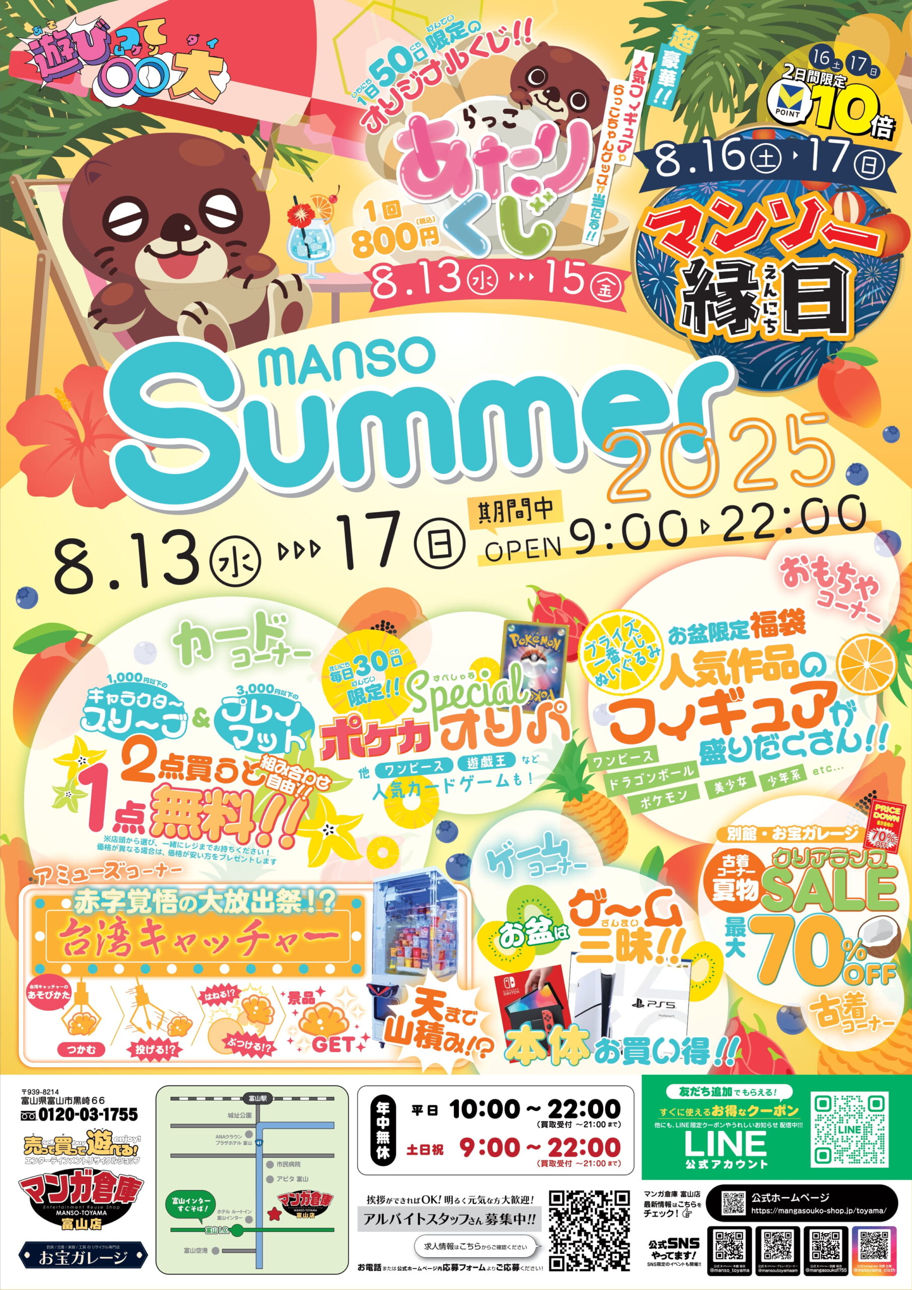 イベント情報《MANSO Summer 2025》【8/13㈬~8/17㈰】 イベント情報 2025年7月17日 イベント情報! 《MANSO Summer 2025》【8/13㈬~8/17㈰】 今年もあつ~い夏がやってきた!! マンソーのお盆はイベント・セール・福袋も盛りだくさん!! ぜひぜひ遊びにきてね~✨🦦 ◆◇◇◆◆◇◇◆◆◇◇◆◆◇◇◆◆◇◇◆◆◇◇◆◆◇◇◆◆◇◇◆◆◇◇◆◆◇◇◆ ・最新のイベント情報はこちら ・最新の買取情報はこちら