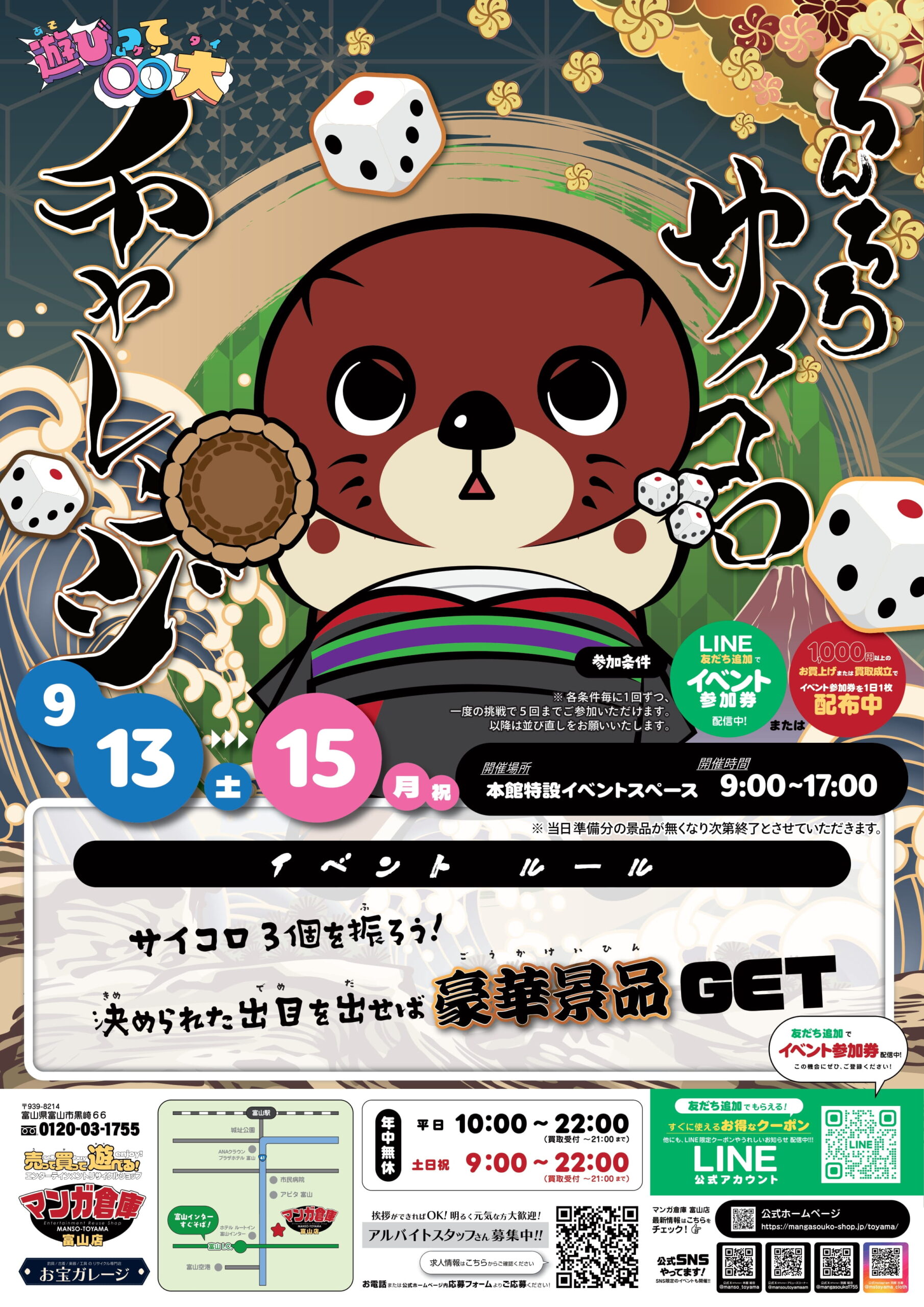 イベント情報《ちんちろサイコロチャレンジ》【9/13・14・15】 イベント情報 2025年8月28日 イベント情報! 《ちんちろサイコロチャレンジ》【9/13・14・15】 のるかそるかの大勝負!! ゾロ目が出たら豪華景品ゲットのチャンス…!? 当日1000円以上のお買い物or買取成立で参加券配布中!! LINEのお友達登録で届くクーポンでも参加できるよ! 皆の挑戦おまちしてます!! ◆◇◇◆◆◇◇◆◆◇◇◆◆◇◇◆◆◇◇◆◆◇◇◆◆◇◇◆◆◇◇◆◆◇◇◆◆◇◇◆ ・最新のイベント情報はこちら ・最新の買取情報はこちら