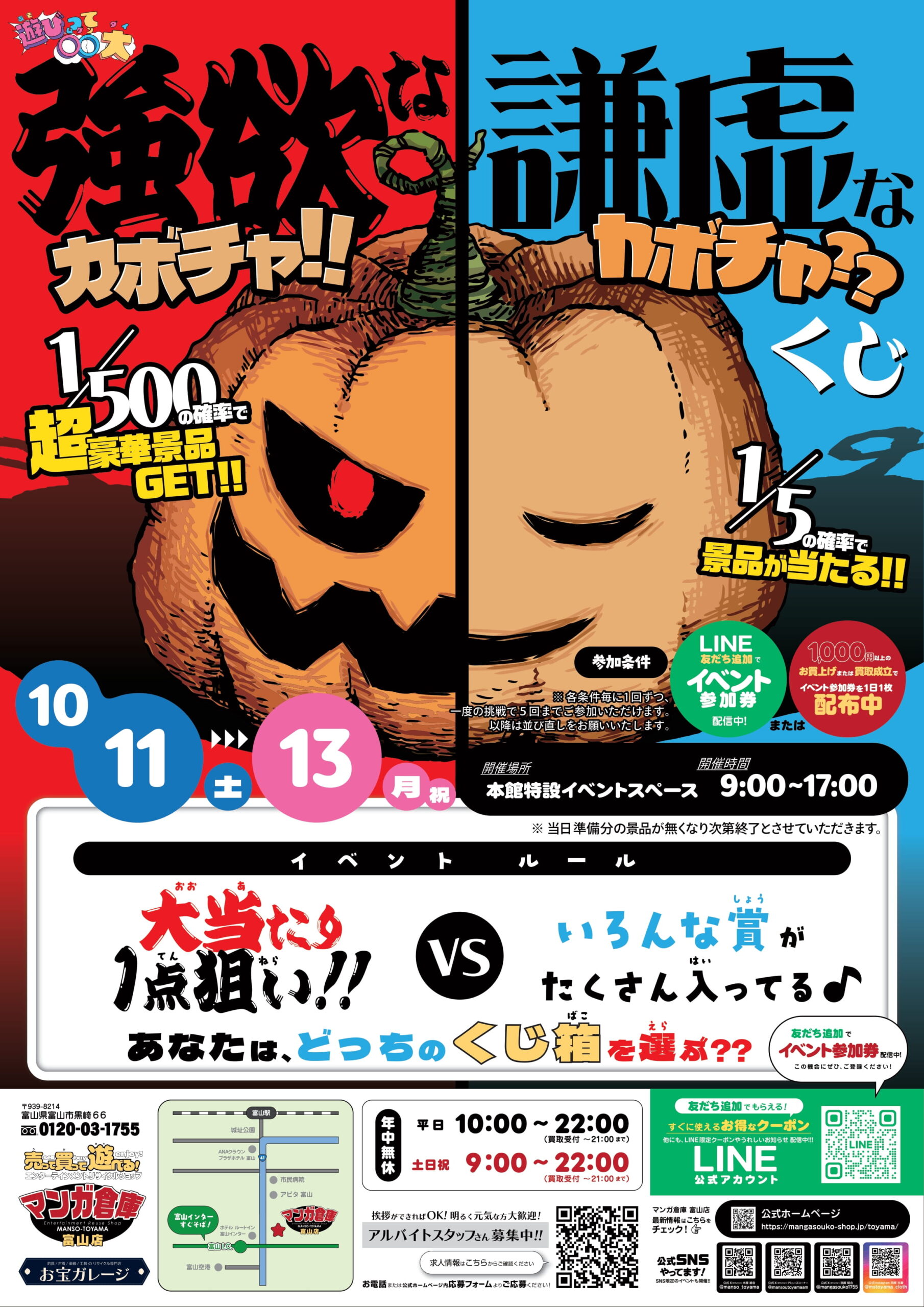 イベント情報《強欲なカボチャ!!謙虚なカボチャ??くじ》【10/11・12・13】 お知らせ! イベント情報 2025年9月28日 イベント情報! 《強欲なカボチャ!!謙虚なカボチャ??くじ》【10/11・12・13】 大当たり1点狙いVSいろんな賞がたくさん入ったくじ引き、どちらかを選んで挑戦!! あなたはどちらのくじ箱を選びますか?? 当日1000円以上のお買い物or買取成立で参加券配布!! LINEのお友達登録で届くクーポンでも参加できます! ◆◇◇◆◆◇◇◆◆◇◇◆◆◇◇◆◆◇◇◆◆◇◇◆◆◇◇◆◆◇◇◆◆◇◇◆◆◇◇◆ ・最新のイベント情報はこちら ・最新の買取情報はこちら