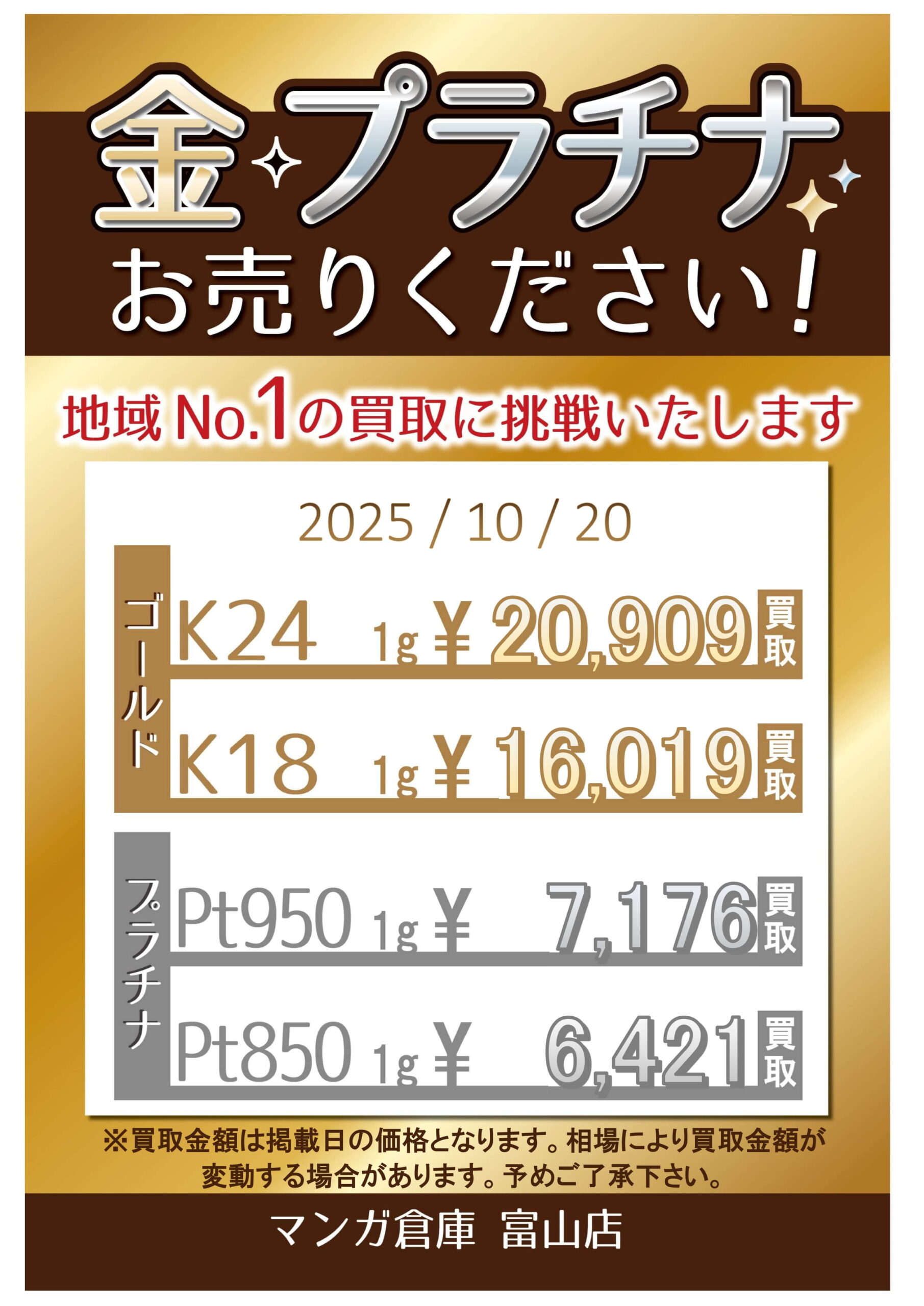 金/プラチナ/金券 買取告知《金・プラチナ》 買取情報 金/プラチナ/金券 2025年10月20日 【金/プラチナ/金券 買取告知】 金・プラチナ 買取告知 更新しました! ※2025/10/20 現在の価格となります。 ******************** ★〖金・プラチナ〗買取告知は👉こちら★ ★〖金券〗買取告知は👉こちら★
