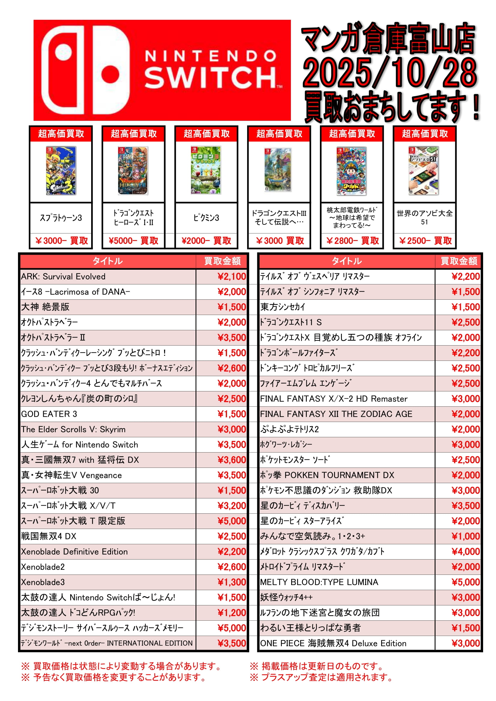 ゲーム 買取告知《Switchソフト買取告知更新》 買取情報 ゲーム 2025年10月28日 【ゲーム 買取告知】 Switchソフト買取告知更新 買取告知 更新しました! ゲームソフト買取告知更新しました! ソフト買取プラスアップキャンペーン中! 対象のソフトをまとめてお売りいただくと、通常の査定金額よりプラスアップ! ぜひ当店までお持ちください! ※2025/10/28 現在の価格となります。 在庫状況などによってお値段が変動いたします。予めご了承ください。 ******************** ★〖ゲーム〗買取告知は👉こちら★