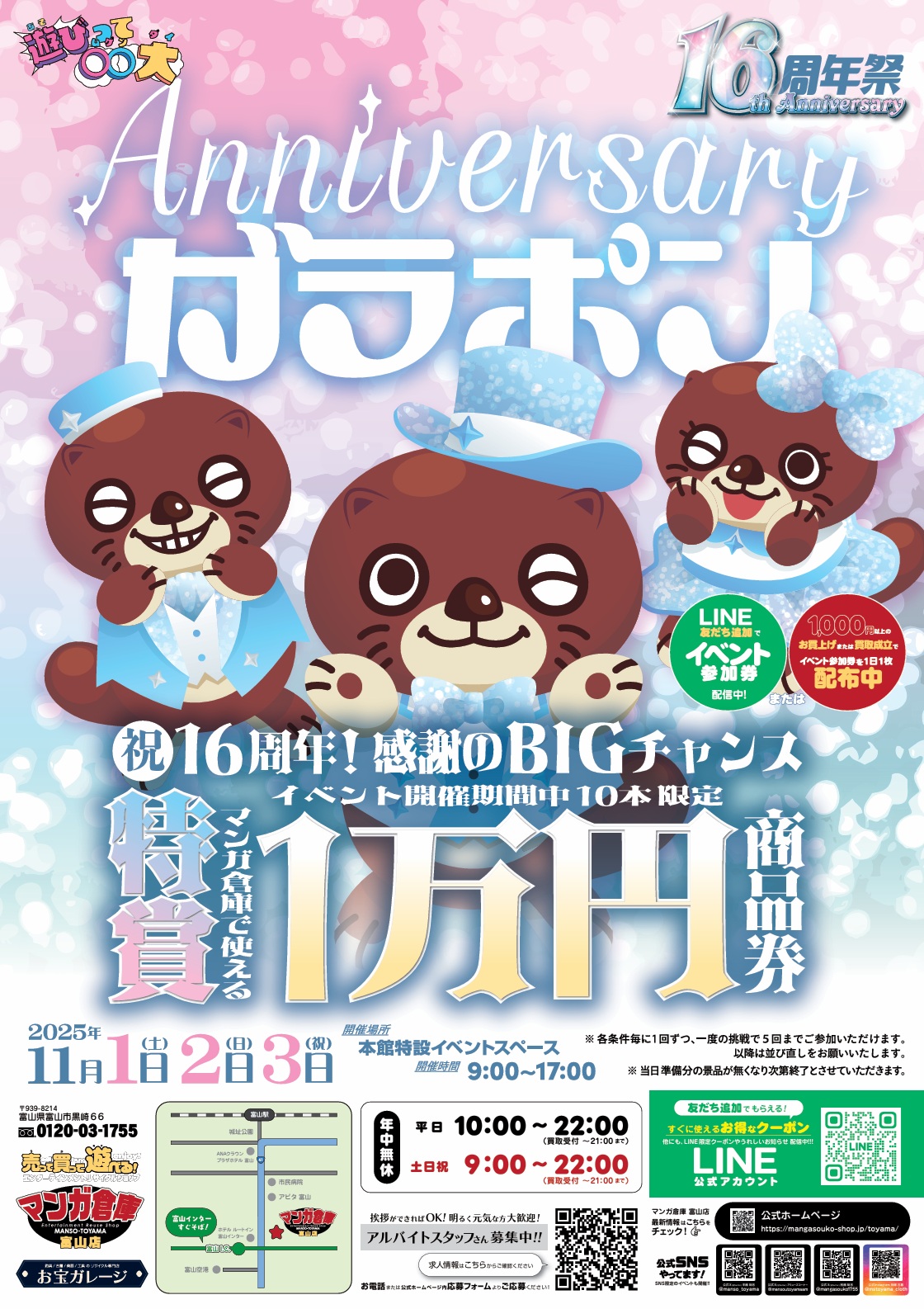イベント情報《Anniversaryガラポン】》【11/1~3日 イベント情報 2025年10月28日 イベント情報! Anniversaryガラポン【11/1~3日】 祝・16周年!!感謝のBIGチャンス イベント開催期間中10本限定! マンガ倉庫で使える1万円商品が当たる!! 1000円以上のお買い上げor買取成立で参加券を配布! またLINEのお友達登録でも1回挑戦できます!! 皆様のご来店をお待ちしております! ◆◇◇◆◆◇◇◆◆◇◇◆◆◇◇◆◆◇◇◆◆◇◇◆◆◇◇◆◆◇◇◆◆◇◇◆◆◇◇◆ ・最新のイベント情報はこちら ・最新の買取情報はこちら