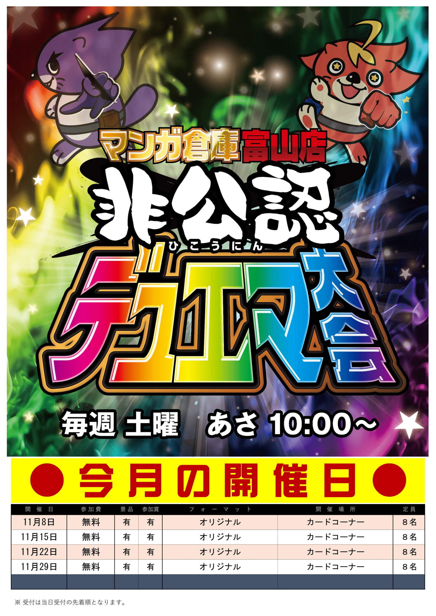 イベント情報《デュエマ大会(非公認)開催【11月毎週土曜 朝10時~】》 イベント情報 2025年11月4日 イベント情報! デュエマ大会(非公認)開催【11月毎週土曜 朝10時~】 マンガ倉庫富山店 デュエマ大会(非公認)復活!! 今月は毎週土曜日 朝10時~ 受付は当日の先着順です!! 参加賞&優勝者には豪華景品も…!? 皆様のご参加、お待ちしてます!! ◆◇◇◆◆◇◇◆◆◇◇◆◆◇◇◆◆◇◇◆◆◇◇◆◆◇◇◆◆◇◇◆◆◇◇◆◆◇◇◆ ・最新のイベント情報はこちら ・最新の買取情報はこちら