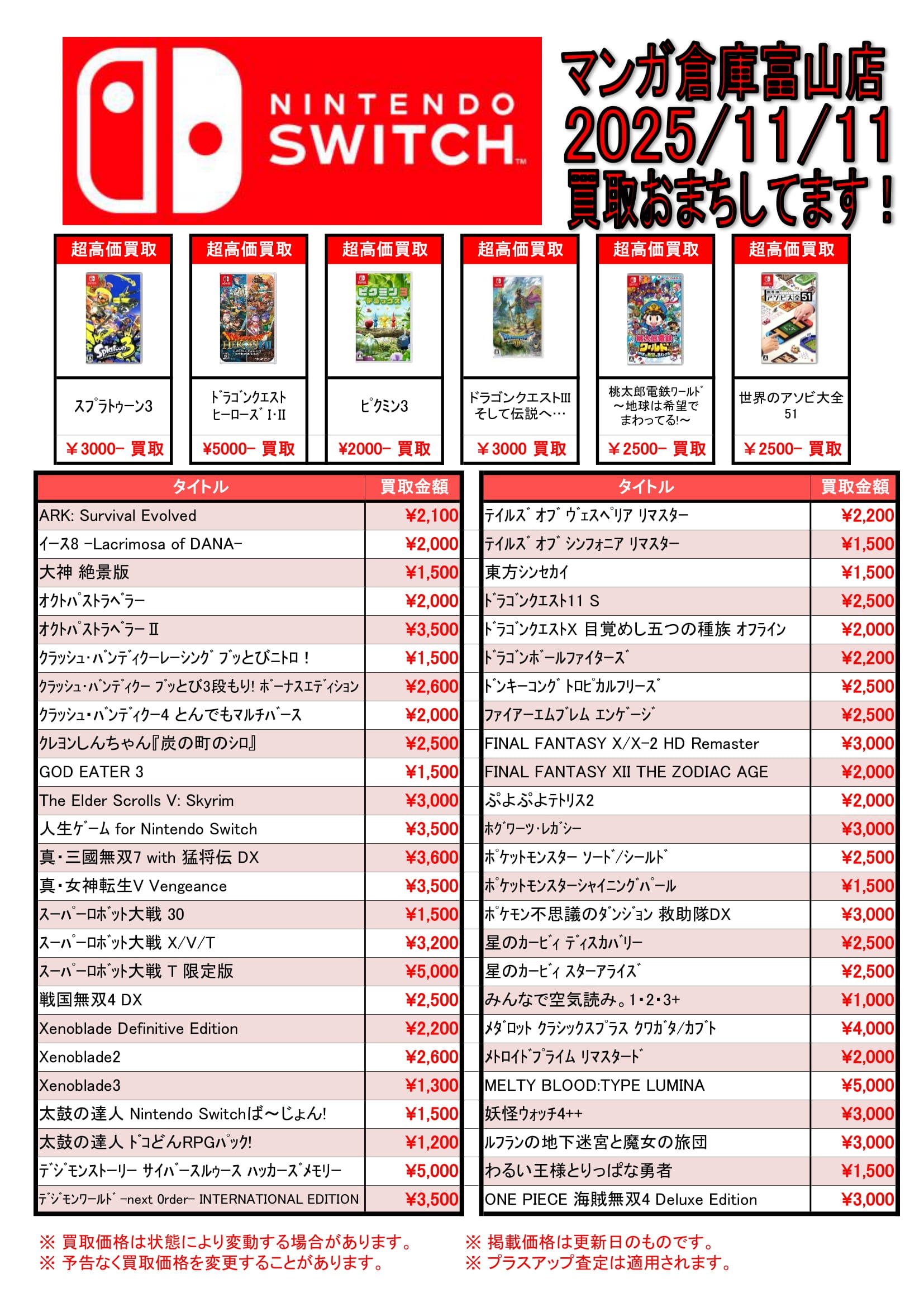 ★Switch/PS5/PS4ソフト買取告知更新★ 買取情報 ゲーム 2025年11月11日 ゲームソフト買取告知更新しました! ソフト買取プラスアップキャンペーン中! 対象のソフトをまとめてお売りいただくと、通常の査定金額よりプラスアップ! ぜひ当店までお持ちください! ※2025/11/11 現在の価格となります。 在庫状況などによってお値段が変動いたします。予めご了承ください。 ******************** ★〖ゲーム〗買取告知は👉こちら★