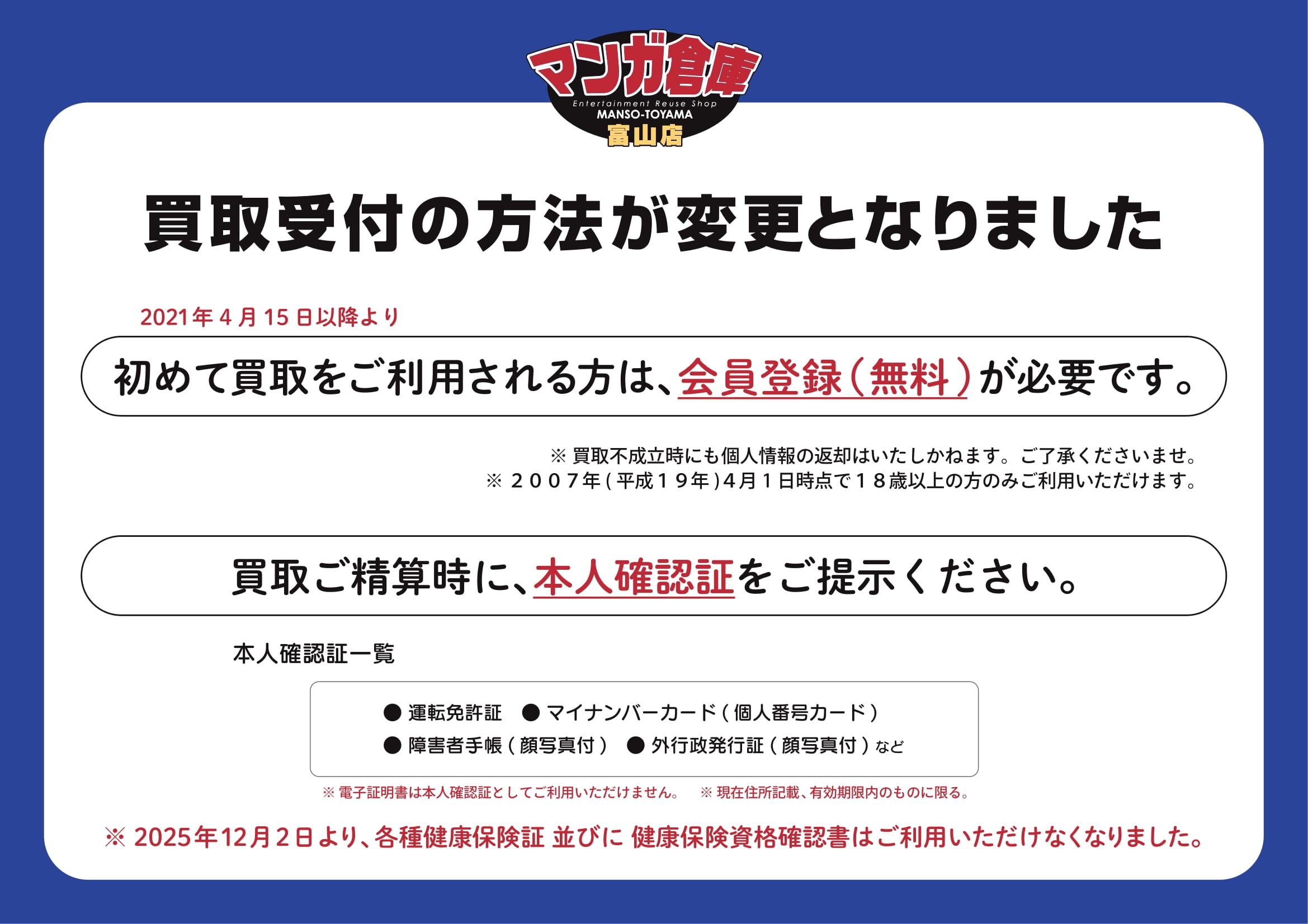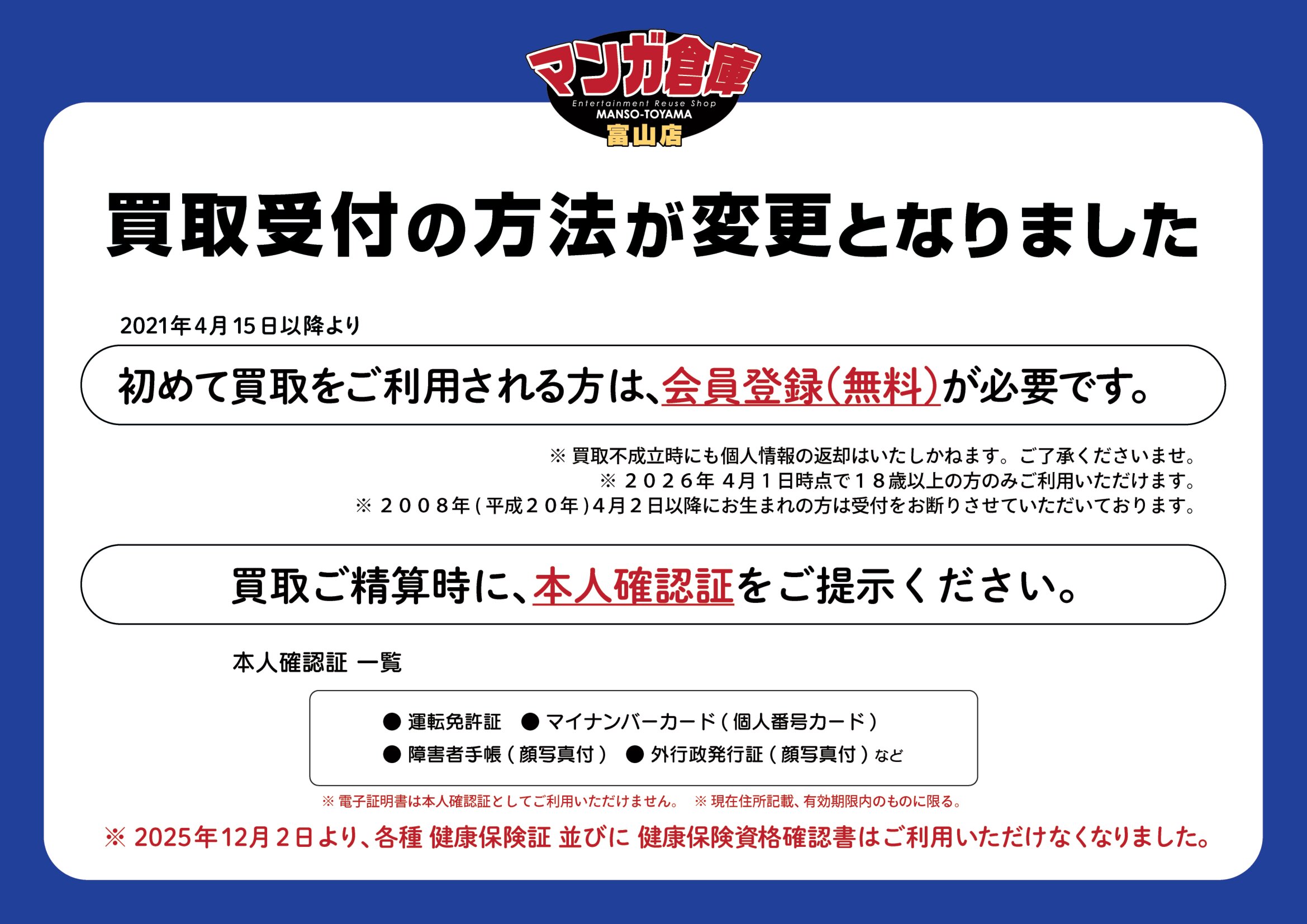 ■《2025年12月2日より》買取の際に必要な本人確認書類の変更について◆#お知らせ■ お知らせ! 買取情報 2025年11月18日 ※買取の際に必要な本人確認書類の変更について※ 2025年12月2日より ・各種健康保険証(資格確認書を含む) ・年金手帳 など 顔写真のない本人確認書類は、当店ではご利用いただけなくなります。 買取をご利用の際には、運転免許証、マイナンバーカード等、顔写真つきの本人確認書類をお持ちください。 お客様にはご不便をおかけいたしますが、何卒ご理解の程よろしくお願いいたします。 2025年11月18日 マンガ倉庫富山店/別館お宝ガレージ