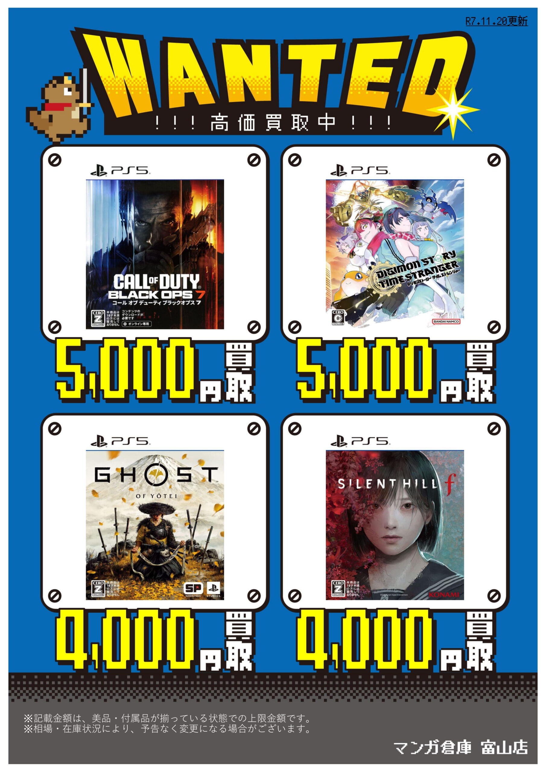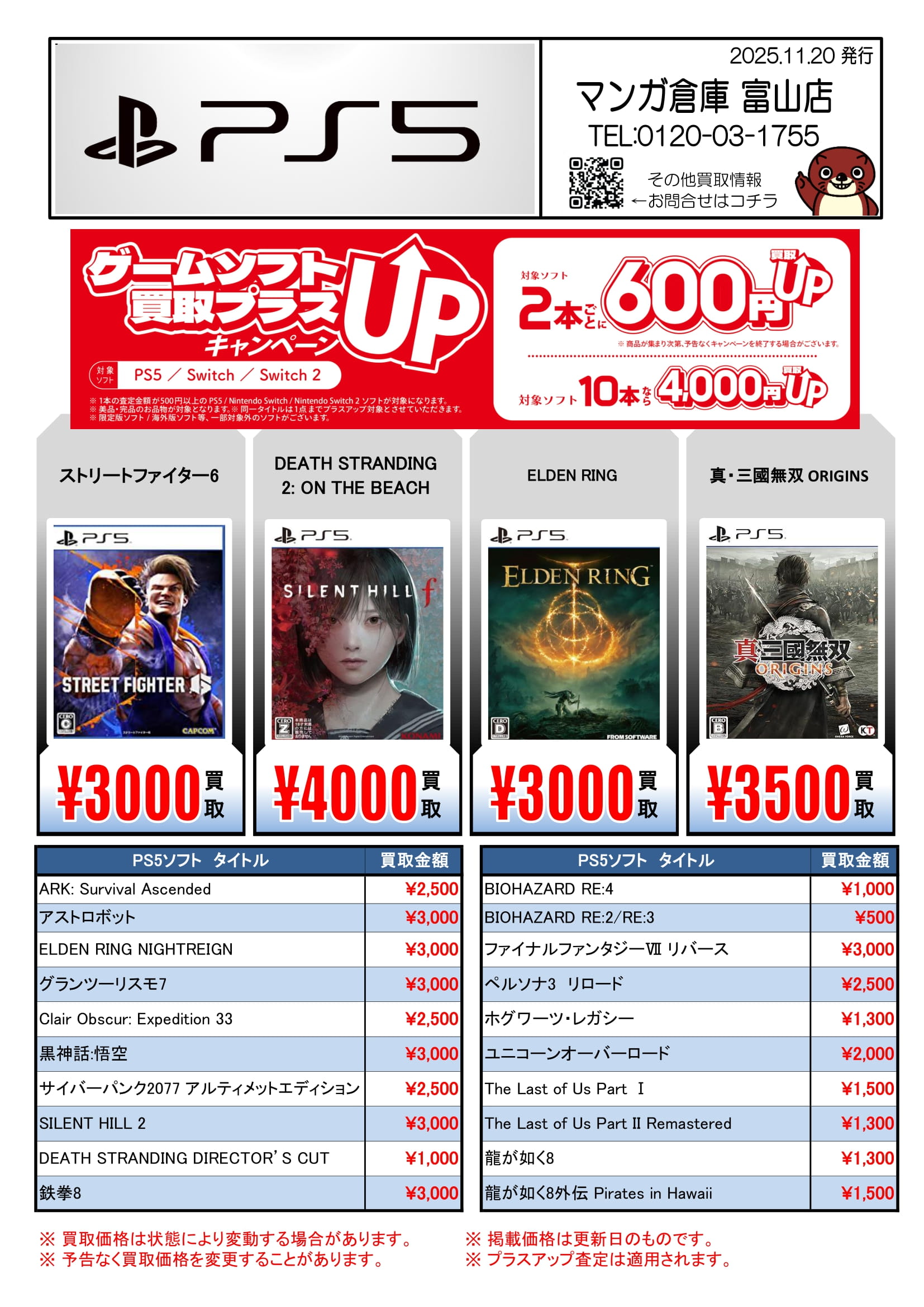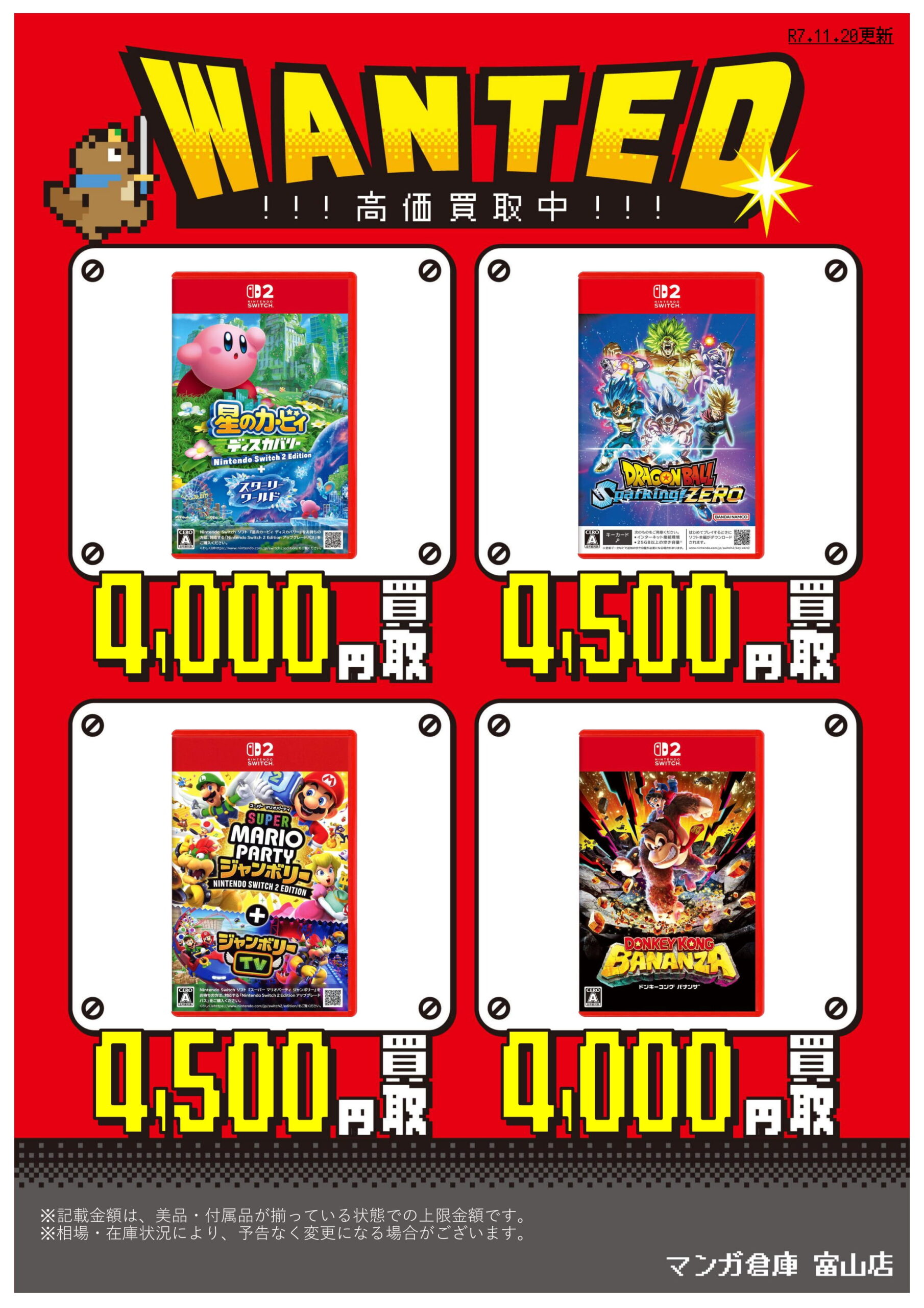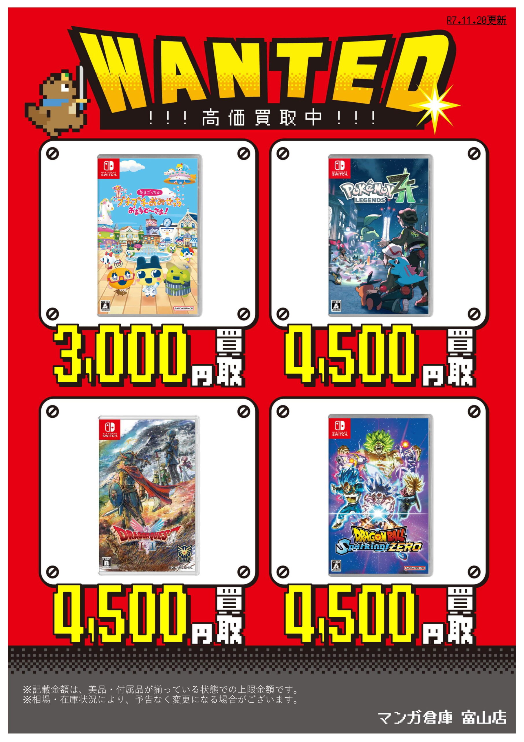 ゲーム 買取情報《Switch/PS5/PS4ソフト買取告知更新》 買取情報 ゲーム 2025年11月21日 【ゲーム 買取情報】 Switch/PS5/PS4ソフト買取告知更新 ゲームソフト買取告知更新しました! ソフト買取プラスアップキャンペーン中! 対象のソフトをまとめてお売りいただくと、通常の査定金額よりプラスアップ! ぜひ当店までお持ちください! ※2025/11/21 現在の価格となります。 在庫状況などによってお値段が変動いたします。予めご了承ください。 ******************** ★〖ゲーム〗買取・入荷情報は👉こちら★