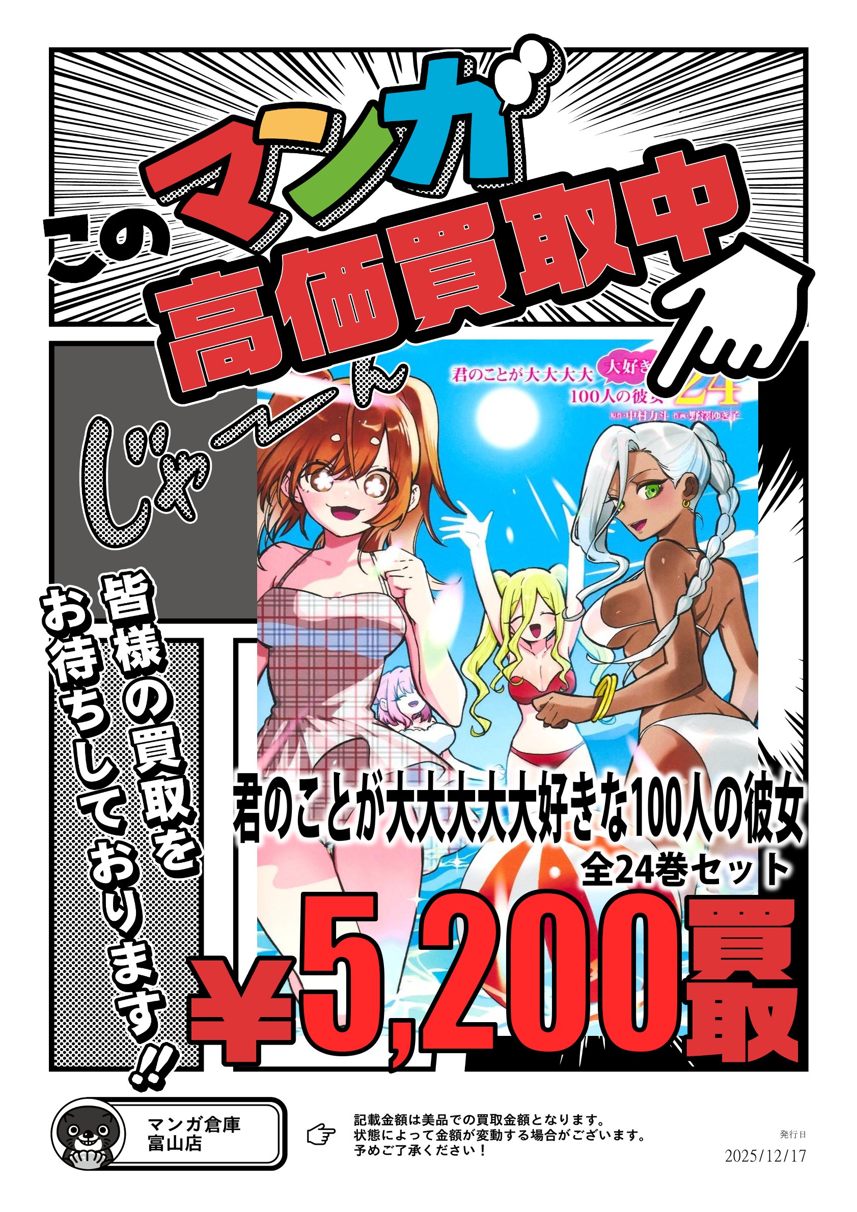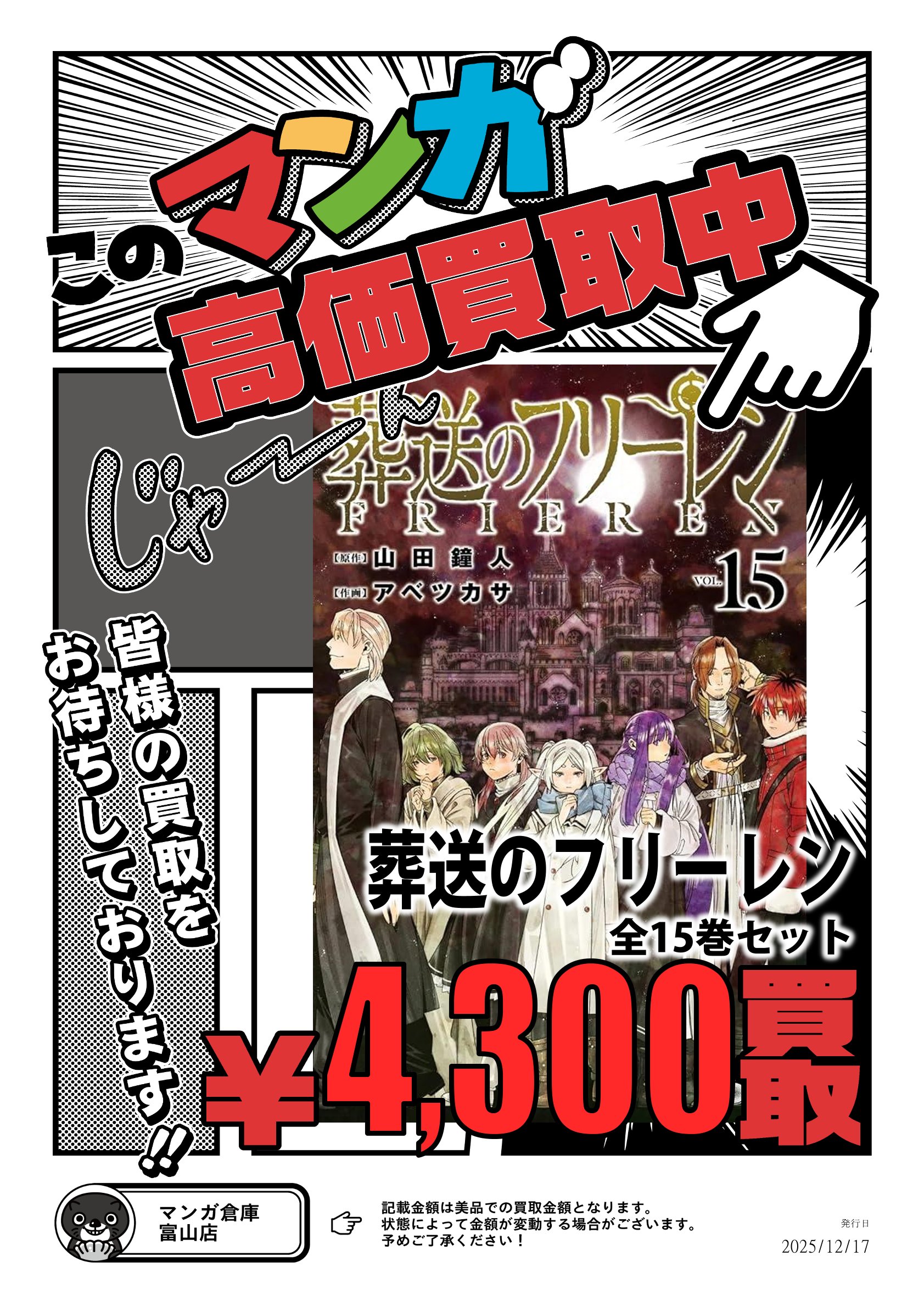 コミック/書籍 買取告知《君のことが大大大大大好きな100人の彼女 葬送のフリーレン》 買取情報 コミック/書籍 2025年12月19日 【コミック/書籍 買取告知】 君のことが大大大大大好きな100人の彼女 葬送のフリーレン 高価買取中 ※2025/12/19 現在の価格となります。 在庫状況などによってお値段が変動いたします。予めご了承ください。 ******************** ★〖コミック/書籍〗買取告知は👉こちら★