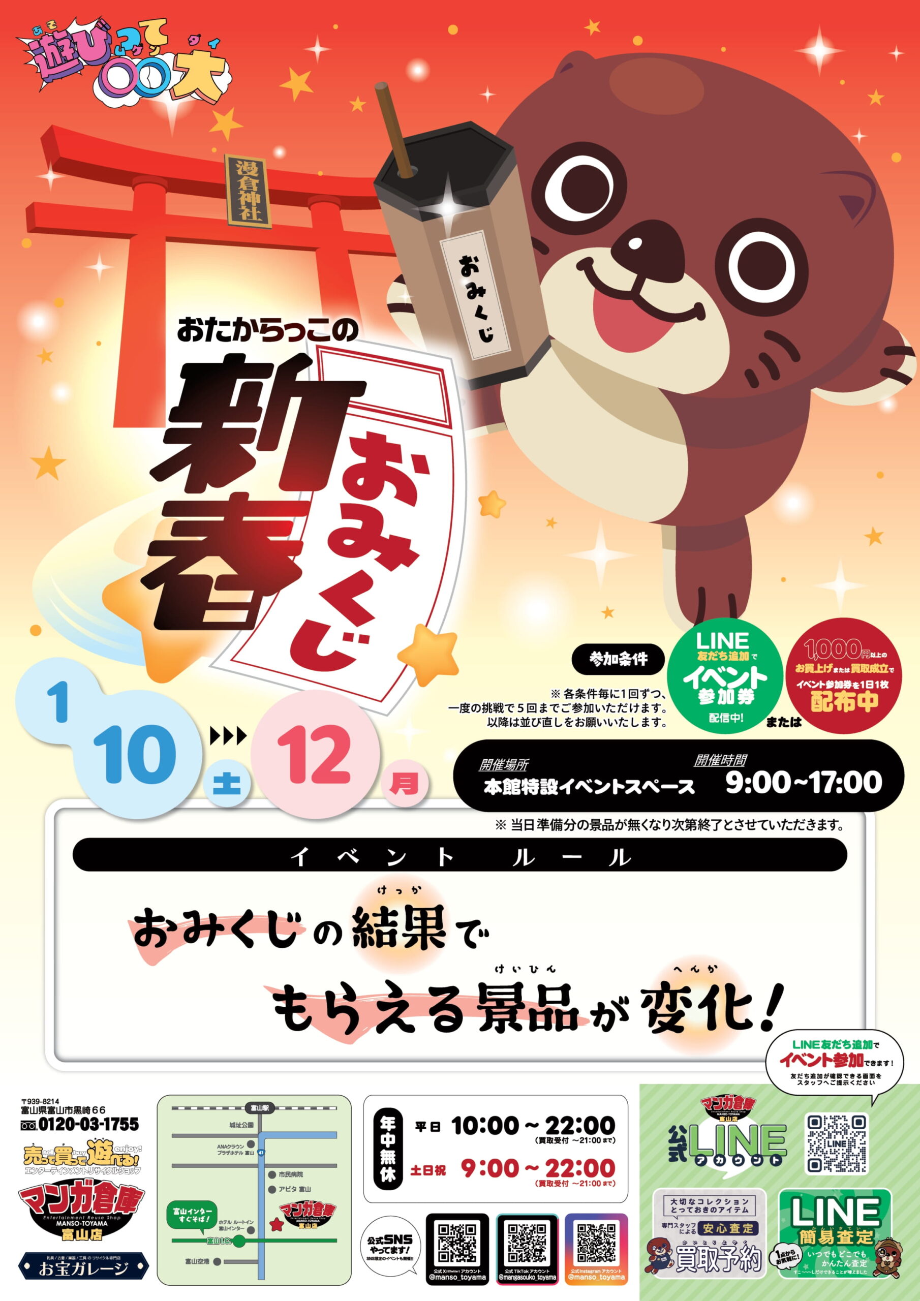 ■《新春おみくじ》【1/10㈯・11㈰・12㈪】■ イベント情報 2026年1月5日 イベント情報! 《新春おみくじ》【1/10㈯・11㈰・12㈪】 三連休は年始の運だめし! 引いたおみくじの結果でもらえる景品が変わるよ 1000円以上の購入・買取成立で参加券GET! LINEのお友達登録でも一回参加できるよ✨ 三連休もマンガ倉庫でお待ちしてます! ◆◇◇◆◆◇◇◆◆◇◇◆◆◇◇◆◆◇◇◆◆◇◇◆◆◇◇◆◆◇◇◆◆◇◇◆◆◇◇◆ ・最新のイベント情報はこちら ・最新の買取情報はこちら