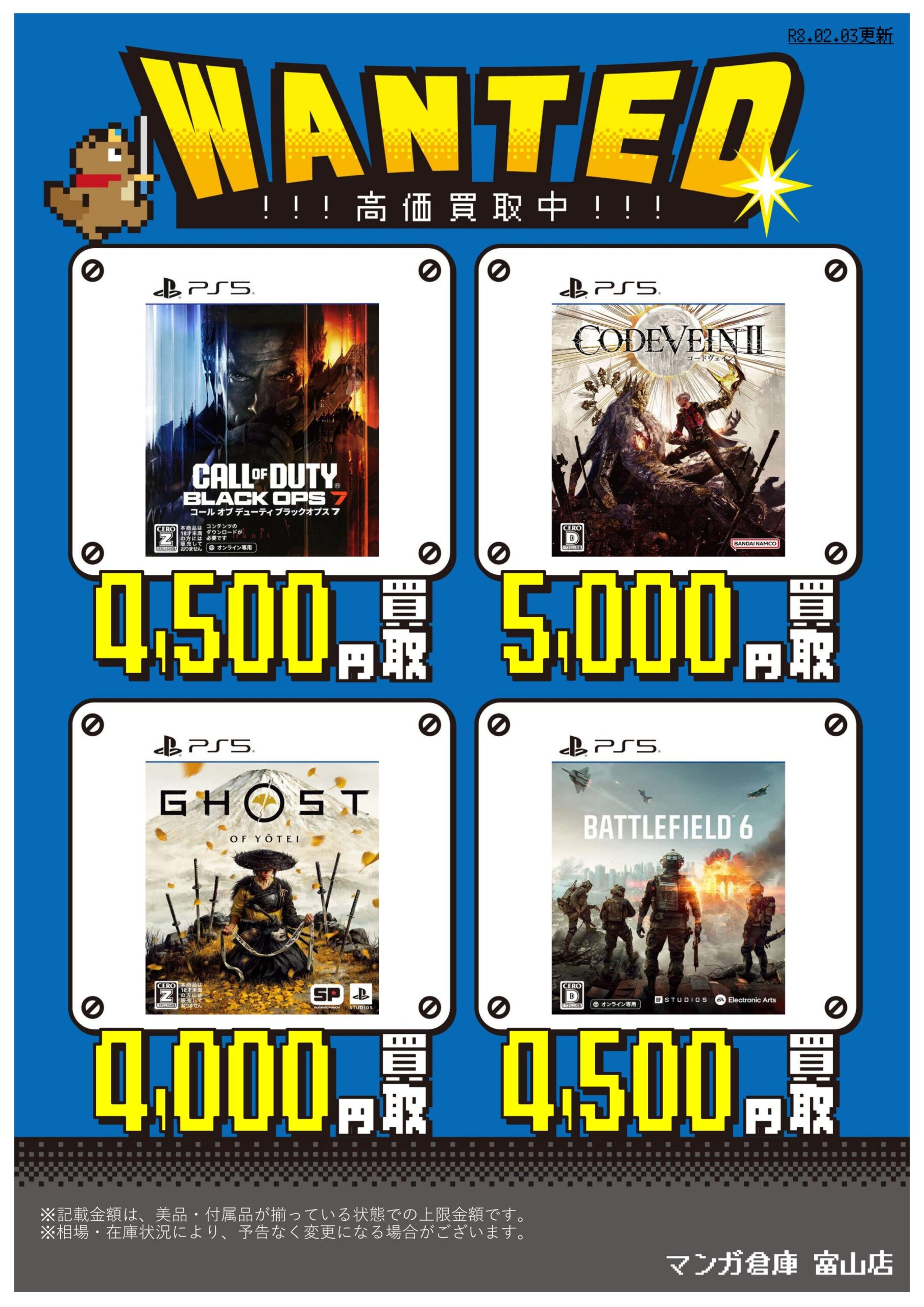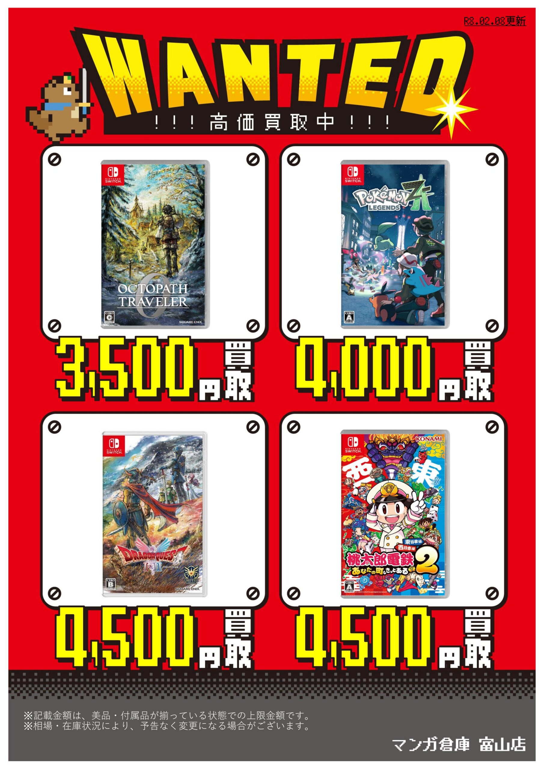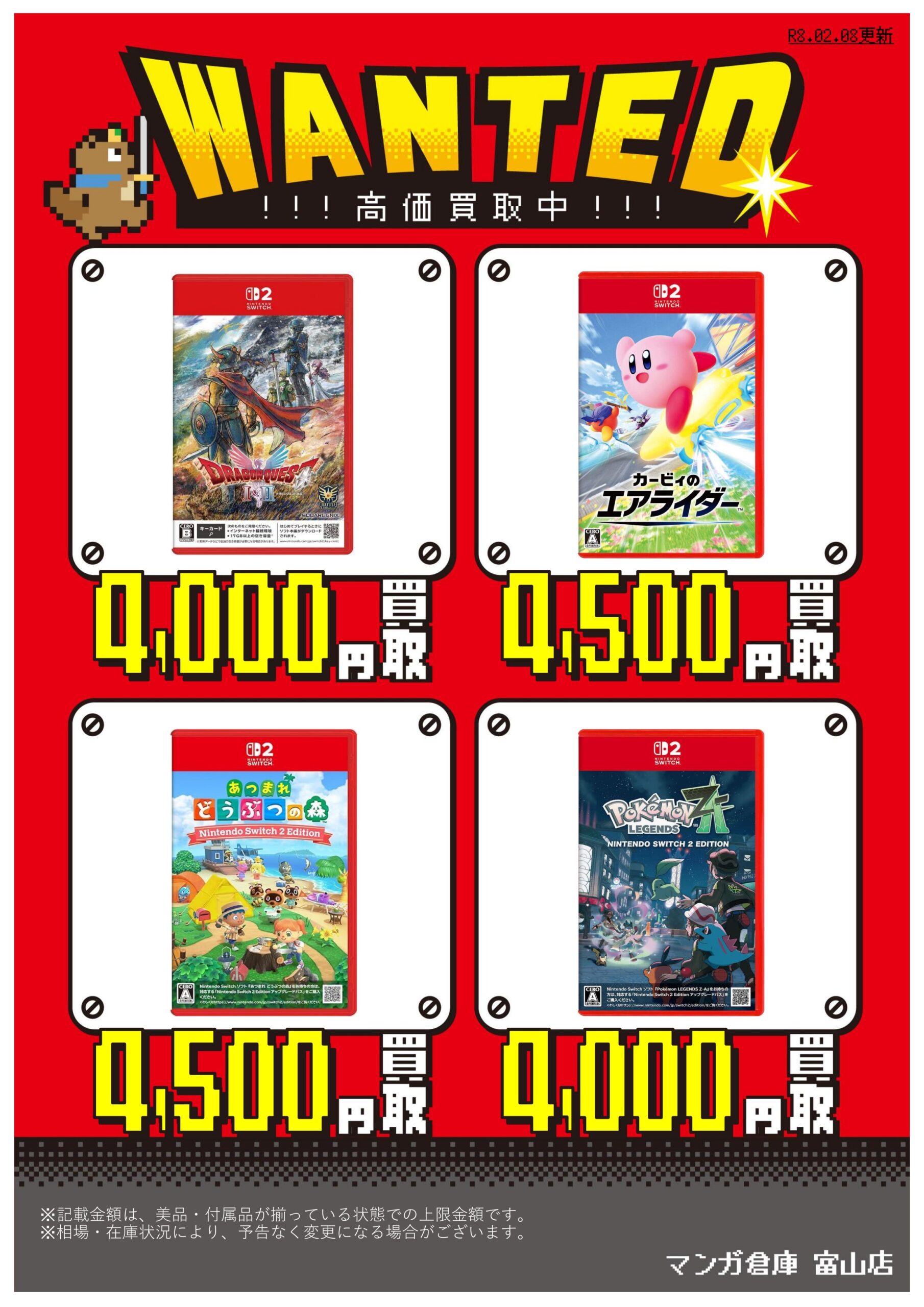 ゲーム 買取告知《Switch/Switch2/PS5ソフト買取告知更新》 買取情報 ゲーム 2026年2月3日 【ゲーム 買取告知】 ゲームソフト買取告知更新しました! ソフト買取プラスアップキャンペーン中! 対象のソフトをまとめてお売りいただくと、通常の査定金額よりプラスアップ! ぜひ当店までお持ちください! ※2026/2/3 現在の価格となります。 在庫状況などによってお値段が変動いたします。予めご了承ください。 ******************** ★〖ゲーム〗買取告知は👉こちら★