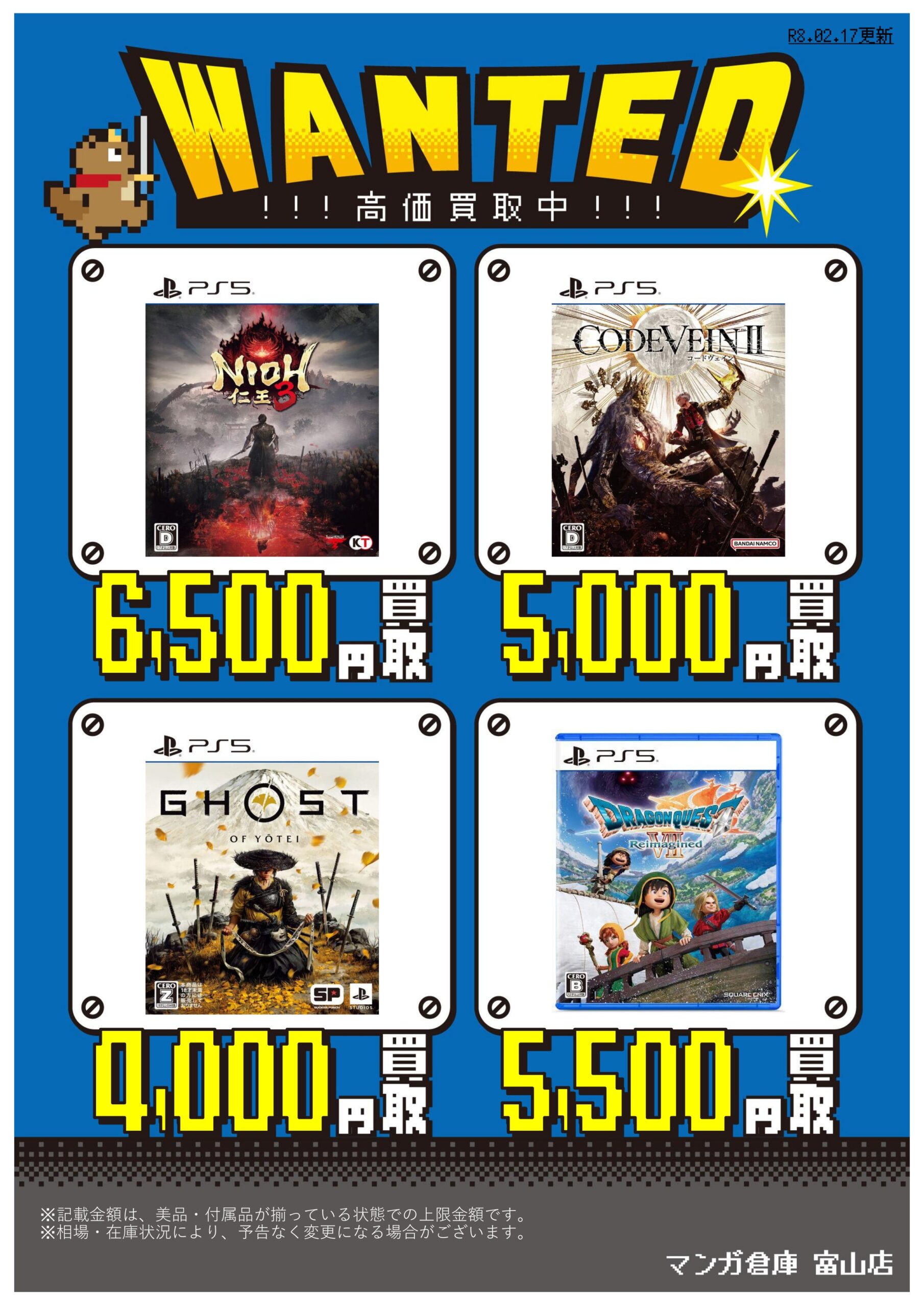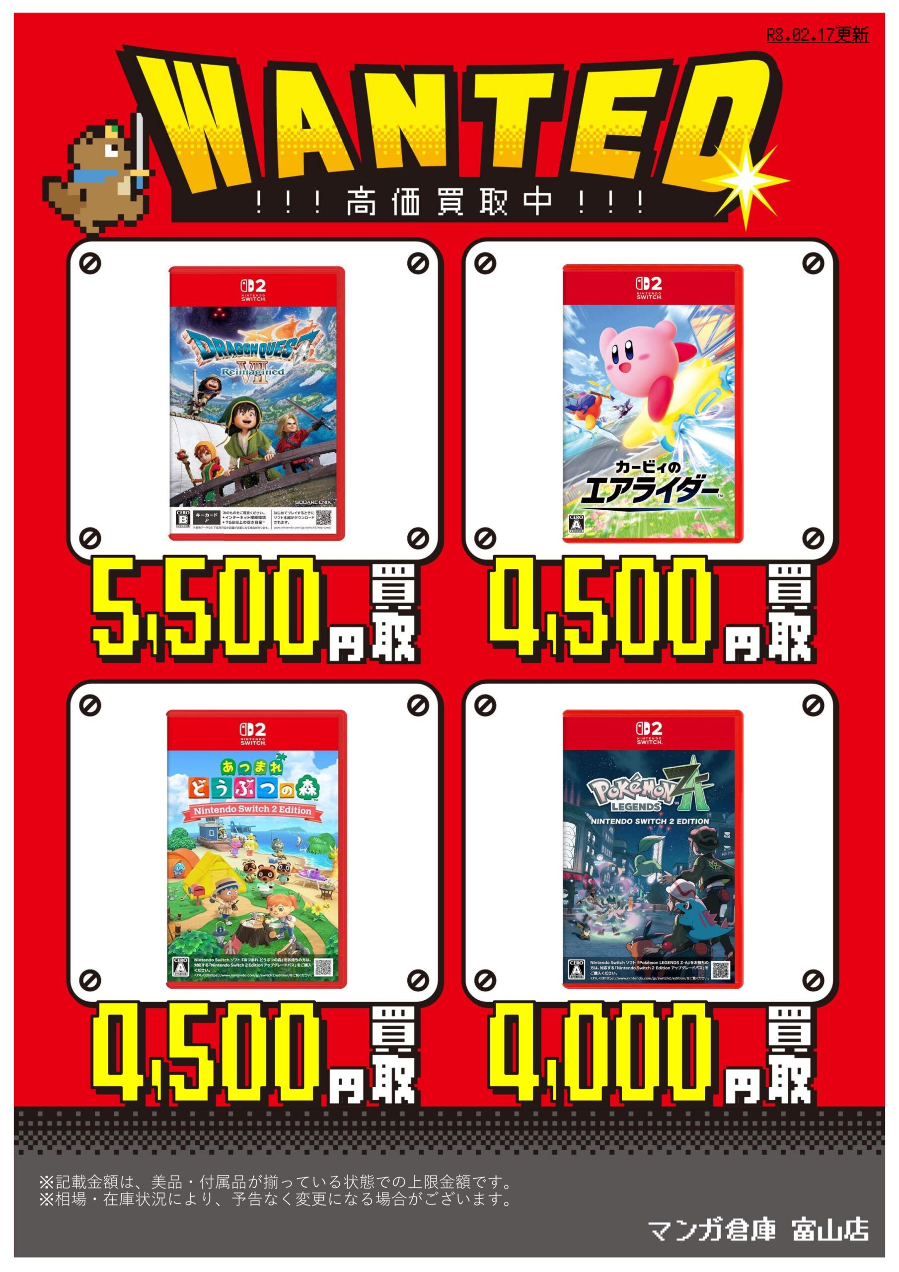 ゲーム 買取告知《Switch/Switch2/PS5ソフト買取告知更新》 買取情報 ゲーム 2026年2月17日 【ゲーム 買取告知】 Switch/Switch2/PS5ソフト買取告知更新 ゲームソフト買取告知更新しました! ソフト買取プラスアップキャンペーン中! 対象のソフトをまとめてお売りいただくと、通常の査定金額よりプラスアップ! ぜひ当店までお持ちください! ※2026/2/17 現在の価格となります。 在庫状況などによってお値段が変動いたします。予めご了承ください。 ******************** ★〖ゲーム〗買取告知は👉こちら★
