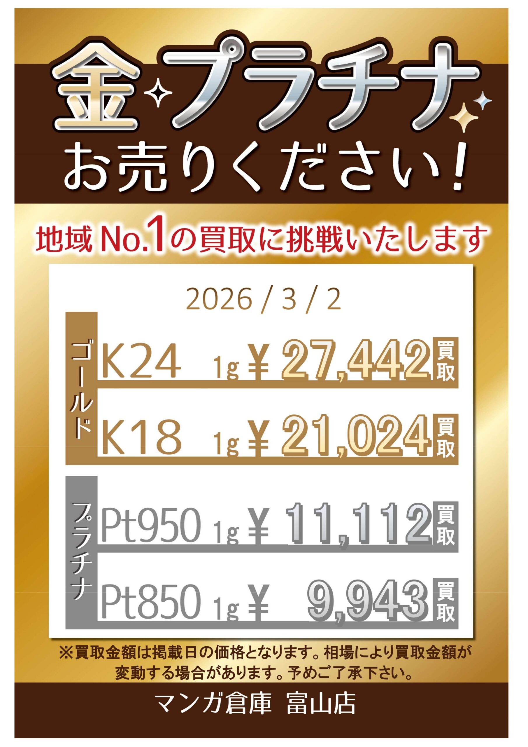 金/プラチナ/金券 買取告知《金・プラチナ》 買取情報 金/プラチナ/金券 2026年3月2日 【金/プラチナ/金券 買取告知】 金・プラチナ 買取告知 更新しました! ※2026/3/2 現在の価格となります。 ******************** ★〖金・プラチナ〗買取告知は👉こちら★ ★〖金券〗買取告知は👉こちら★