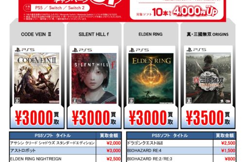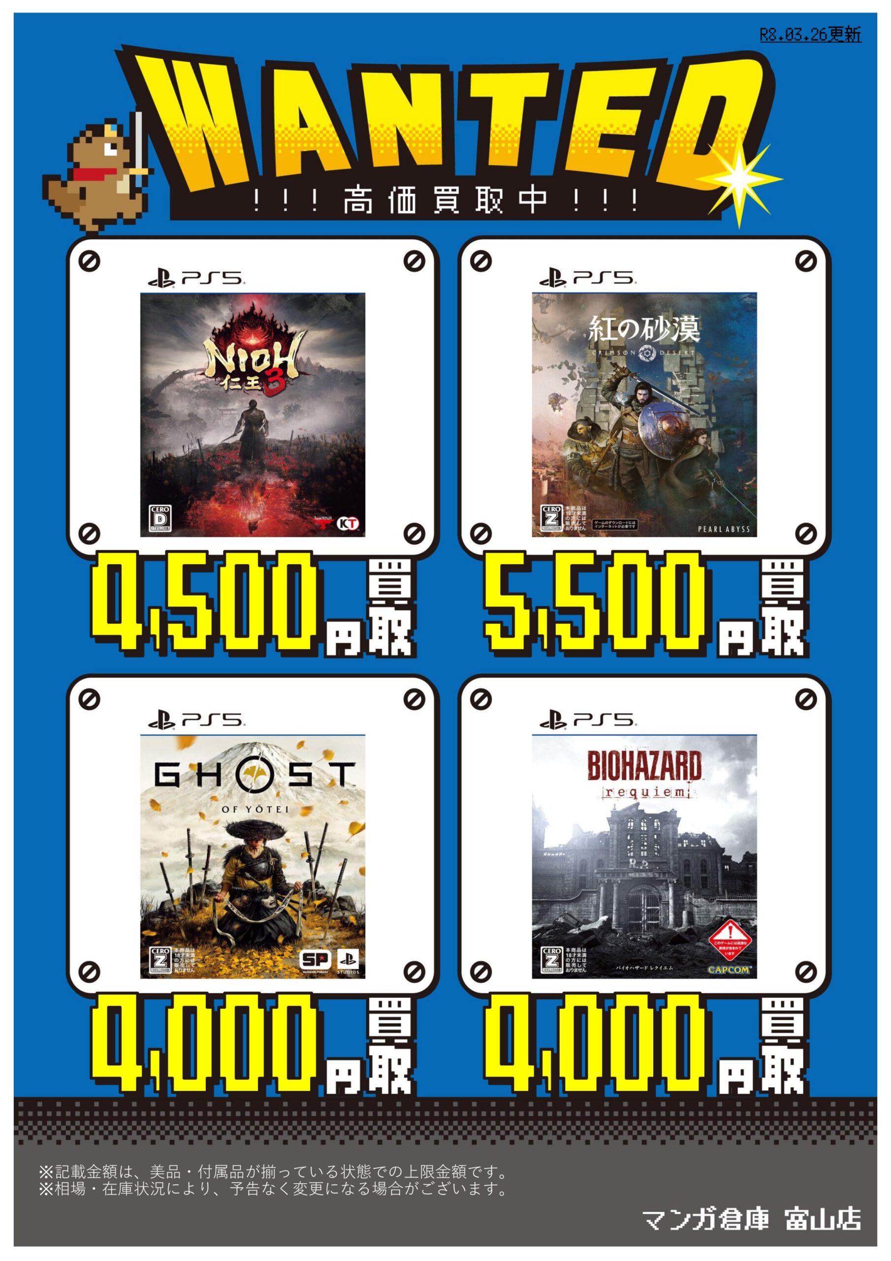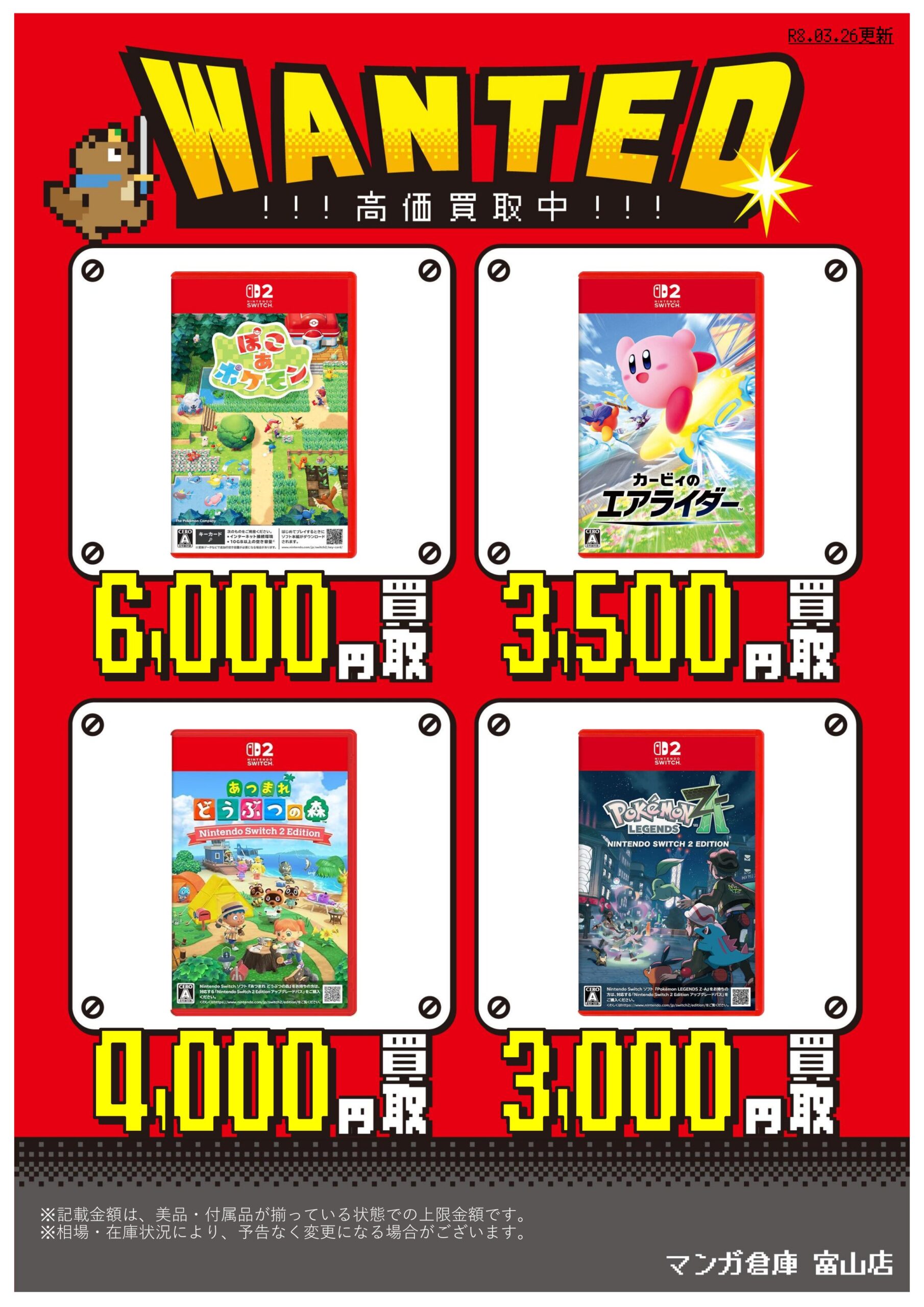 ★ゲーム Switch/Switch2/PS5ソフト買取告知更新★ 買取情報 ゲーム 2026年3月26日 【ゲーム 買取告知】 Switch/Switch2/PS5ソフト買取告知更新 更新しました! ゲームソフト買取告知更新しました! ソフト買取プラスアップキャンペーン中! 対象のソフトをまとめてお売りいただくと、通常の査定金額よりプラスアップ! ぜひ当店までお持ちください! ※2026/3/26 現在の価格となります。 在庫状況などによってお値段が変動いたします。予めご了承ください。 ******************** ★〖ゲーム〗買取告知は👉こちら★