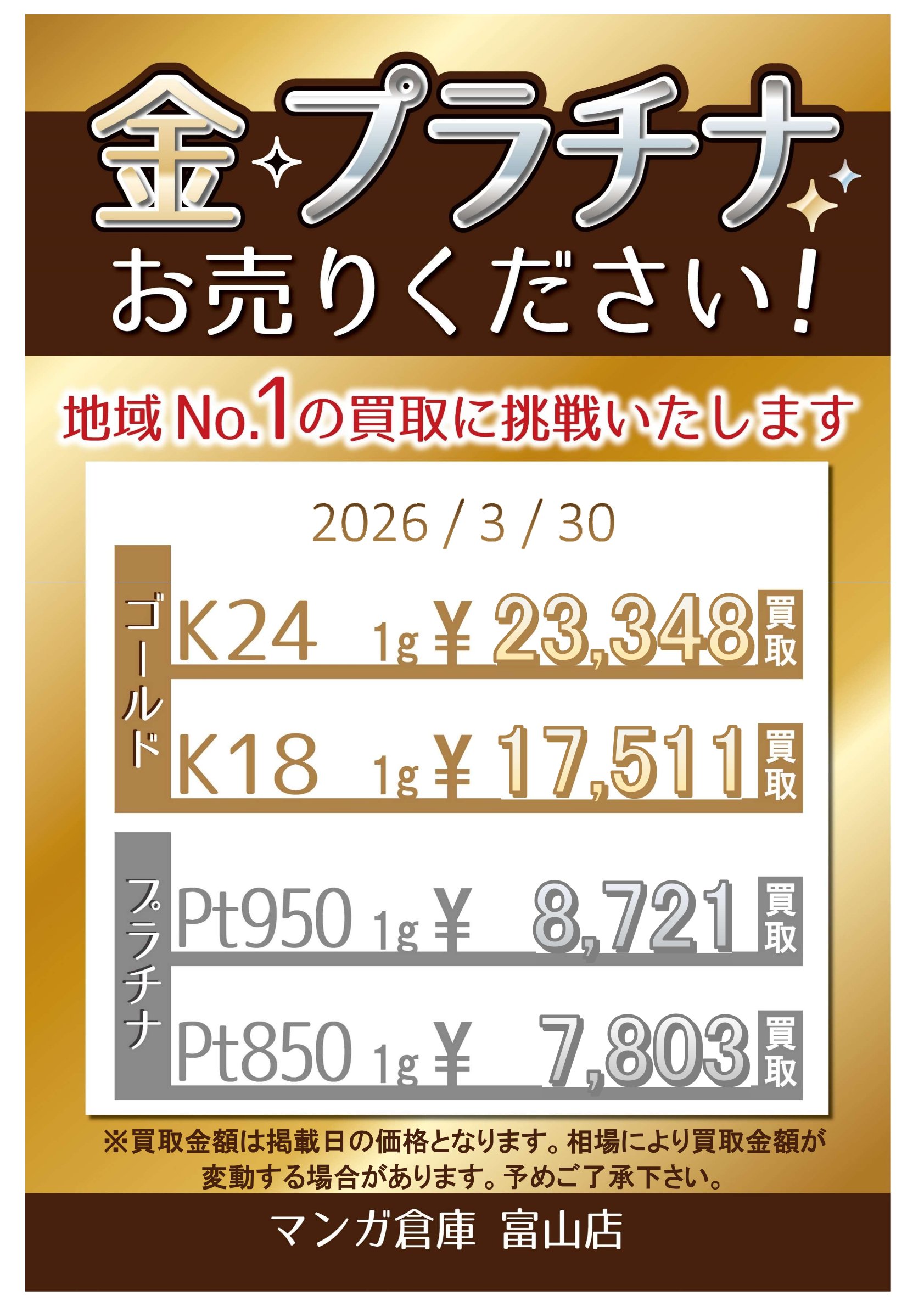 金/プラチナ/金券 買取告知《金・プラチナ》 買取情報 金/プラチナ/金券 2026年3月30日 【金/プラチナ/金券 買取告知】 買取告知 更新しました! ※2026/3/30 現在の価格となります。 ******************** ★〖金・プラチナ〗買取告知は👉こちら★ ★〖金券〗買取告知は👉こちら★