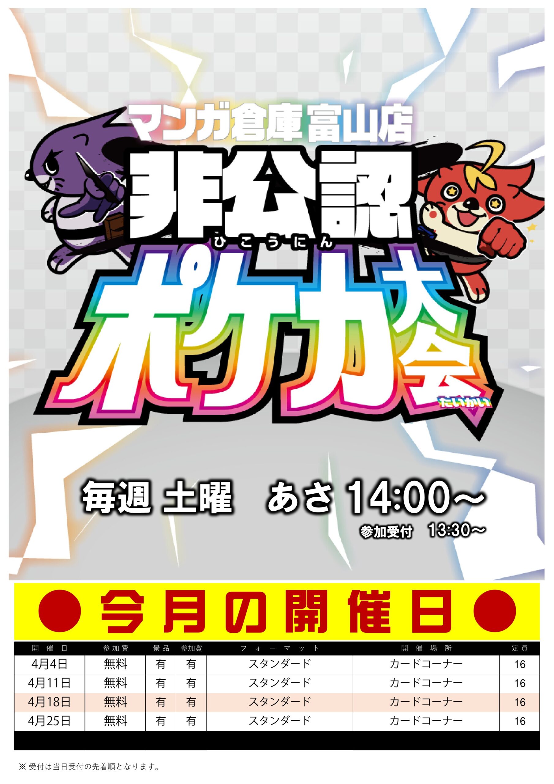 ★《【デュエマ・ポケモン】4月のマンソーカード大会【土曜日開催】》★ イベント情報 カード 2026年3月31日 イベント情報! 《【デュエマ・ポケモン】4月のマンソーカード大会【土曜日開催】》 マンソーカード大会(非公認) 4月の開催は… ★デュエルマスターズ【土曜 あさ9:30時~】 ★ポケモンカード【土曜 ひる14時~】 受付は各回開催の30分前より、先着順です 参加賞あり!優勝賞品あり! 来月も皆様のご参加お待ちしております✨ ◆◇◇◆◆◇◇◆◆◇◇◆◆◇◇◆◆◇◇◆◆◇◇◆◆◇◇◆◆◇◇◆◆◇◇◆◆◇◇◆ ・最新のイベント情報はこちら ・最新の買取情報はこちら