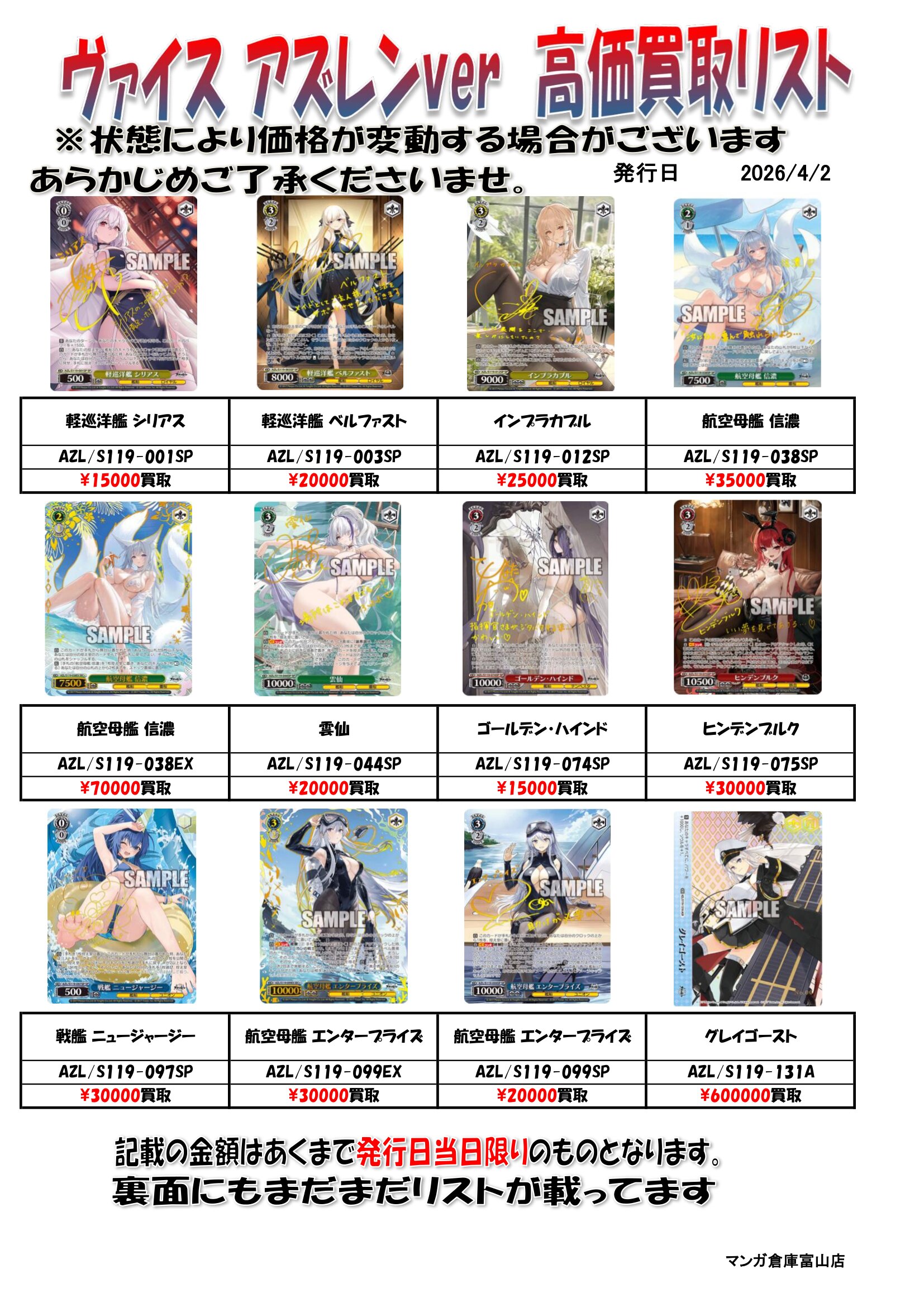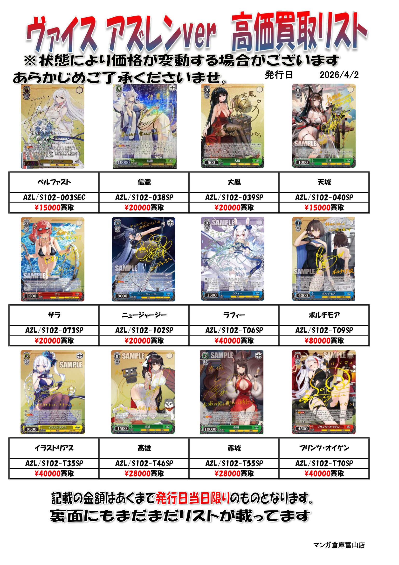 カード 買取告知《ヴァイスシュバルツ買取》 買取情報 カード 2026年4月2日 【カード 買取告知】 ヴァイスシュバルツ買取 買取告知 更新しました! ヴァイス アズレン 高価買取中 ※2026/4/2 現在の価格となります。 在庫状況などによってお値段が変動いたします。予めご了承ください。 ******************** ★〖カード〗買取告知は👉こちら★