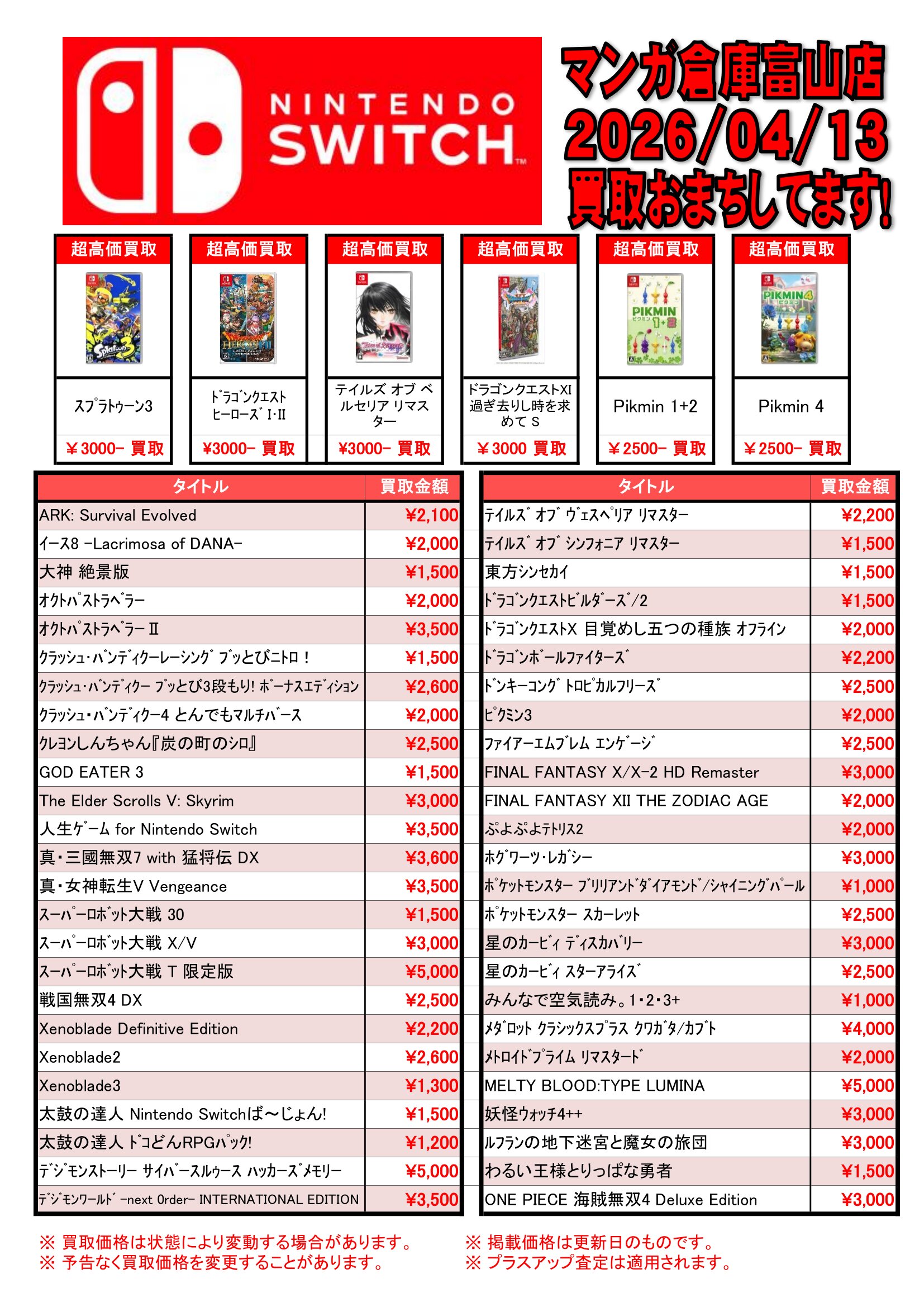 ゲーム 買取告知《Switch/Switch2/PS5ソフト買取告知更新》 買取情報 ゲーム 2026年4月13日 【ゲーム 買取告知】 ゲームソフト買取告知更新しました! ソフト買取プラスアップキャンペーン中! 対象のソフトをまとめてお売りいただくと、通常の査定金額よりプラスアップ! ぜひ当店までお持ちください! ※2026/4/13 現在の価格となります。 在庫状況などによってお値段が変動いたします。予めご了承ください。 ******************** ★〖ゲーム〗買取告知は👉こちら★