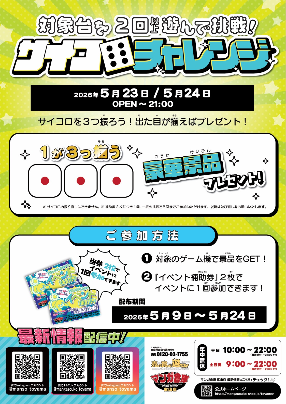 補助券を二枚あつめると、【5/23・24】に開催される【サイコロチャレンジ】に一回参加できるぞ!