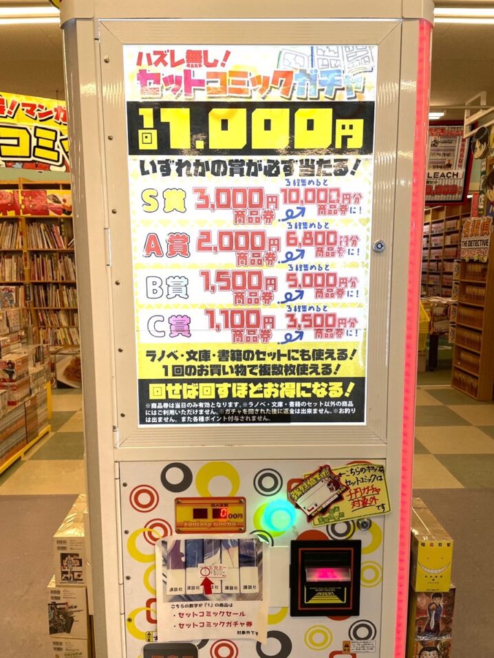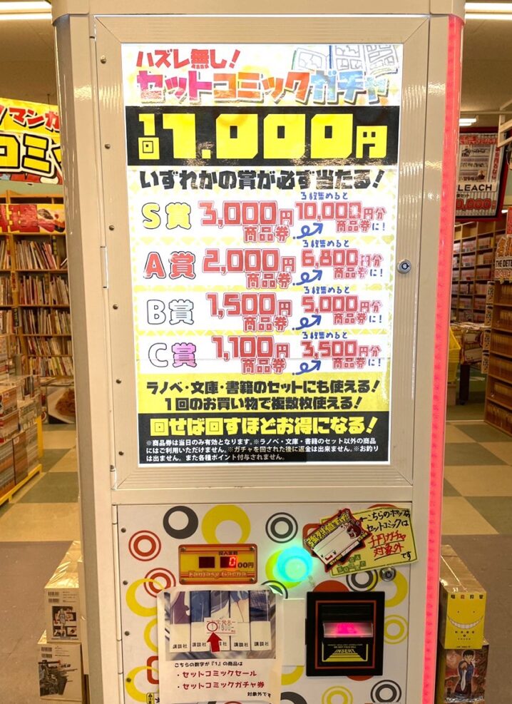 本コーナーからのお知らせ! ご好評いただいております本コーナーの「セットコミックガチャ」 セットコミック、セットラノベ、セット書籍をお得に買えちゃう割引チケットをゲットできるガチャです! この度、見た目が変わって新札対応…