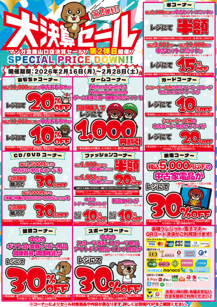 ★✨大決算セール第2弾 開催✨★ 📢マンガ倉庫山口店では、本日2月16日(月)から大決算セール第2弾目を開催❗️ 開催期間は2月16日(月)~2月2…
