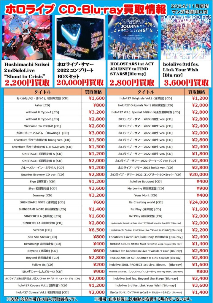 CD・DVDコーナーからのお知らせ! 現在当店ではVTuberグループ「ホロライブ」のCD・Blu-rayを買取強化中! 買取告知に掲載されている商品も、掲載されていない商品も全力で買取させて頂きます! ホロライブ商品を…